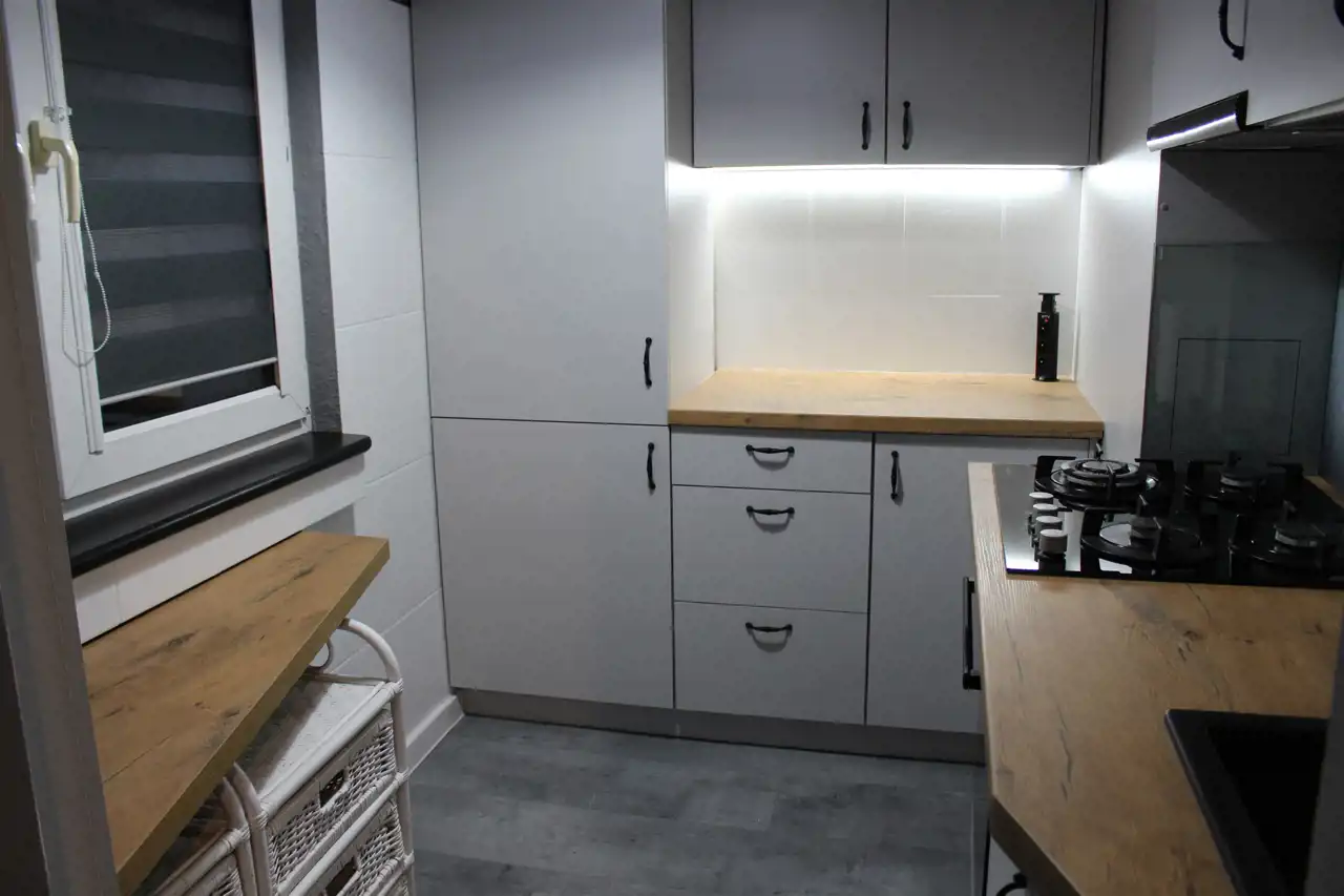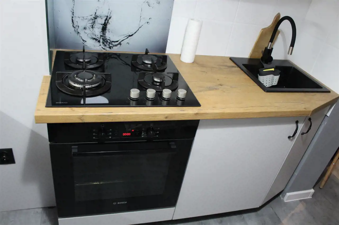 - kuchnią z meblami pod wymiar i sprzętem AGD - lodówka, piekarnik, płyta gazowa,