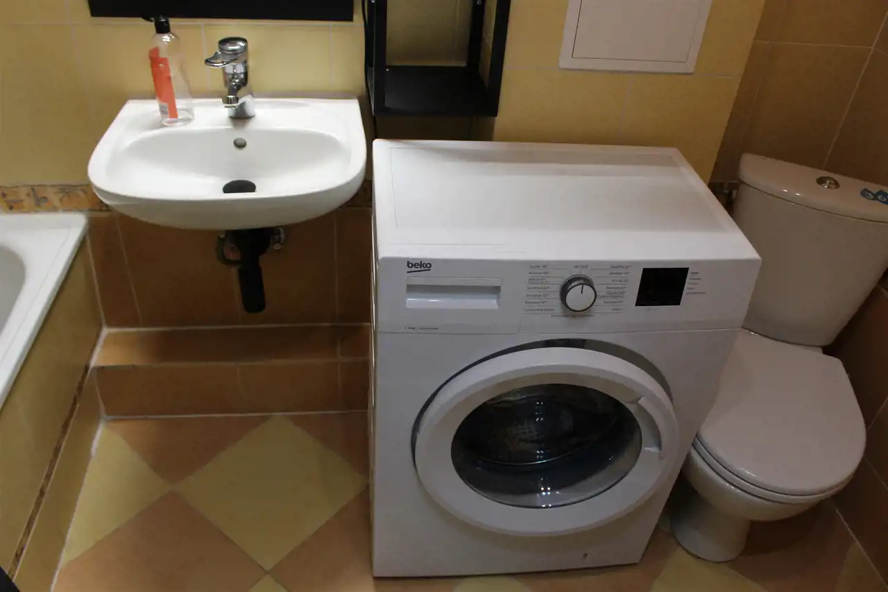 - łazienką z wanną, umywalką z lustrem, WC-kompakt oraz pralką,
