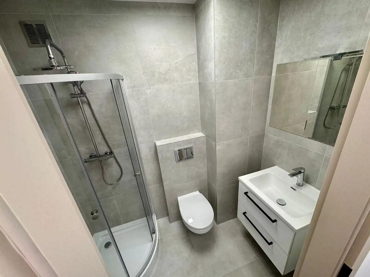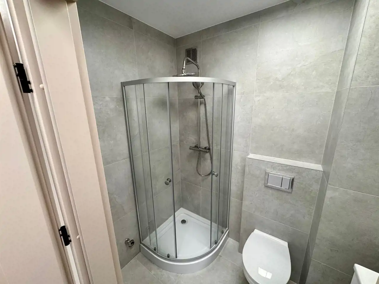 Łazienka została zaprojektowana jak małe, prywatne spa: eleganckie szarości, minimalistyczne detale i nowoczesna kabina prysznicowa sprawiają, że codzienny prysznic zamienia się w chwilę luksusu.