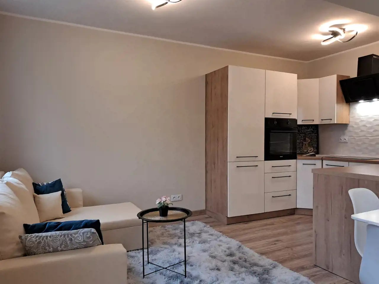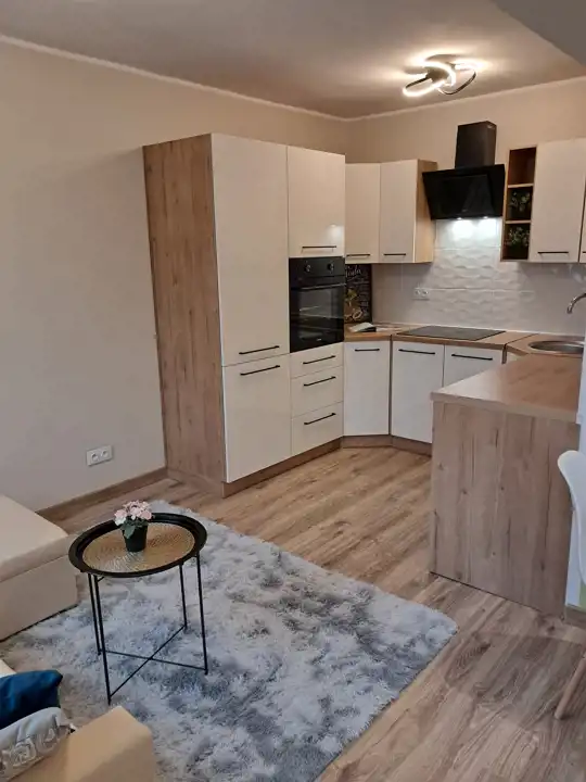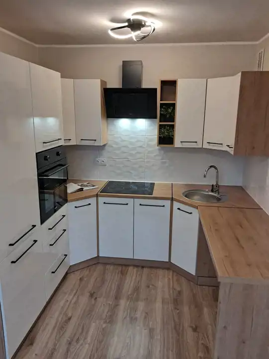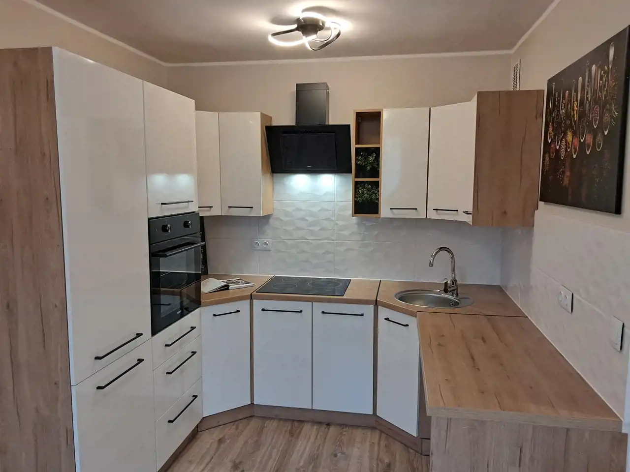 - nowoczesne meble kuchenne w zabudowie (AGD: płyta indukcyjna, okap, piekarnik , miejsce na zmywarkę i pralkę, szafka - słupek na lodówkę w zabudowie)