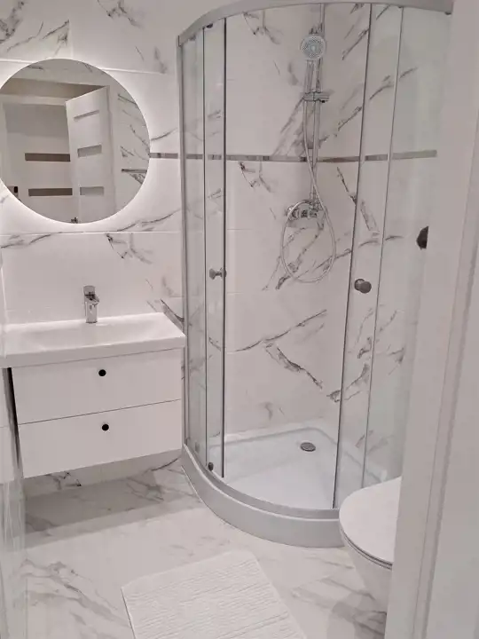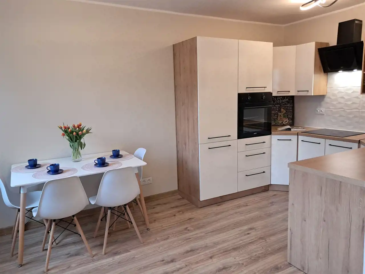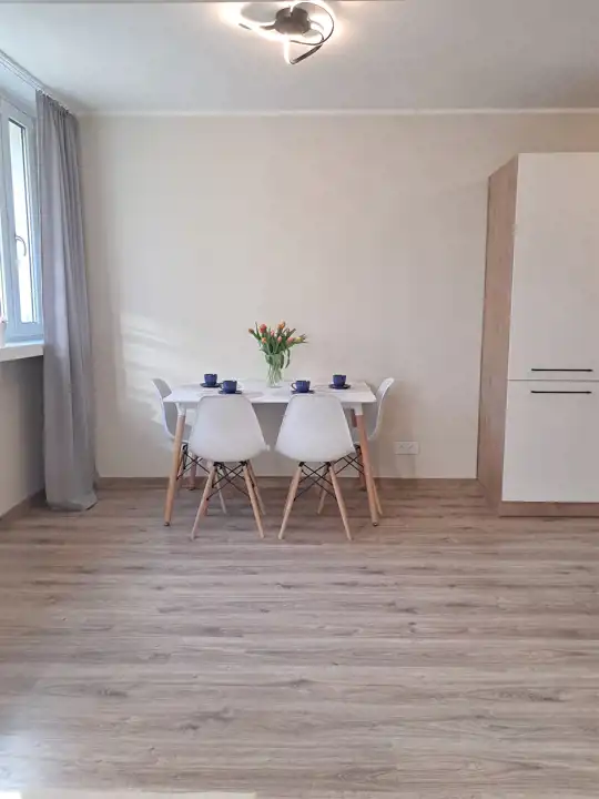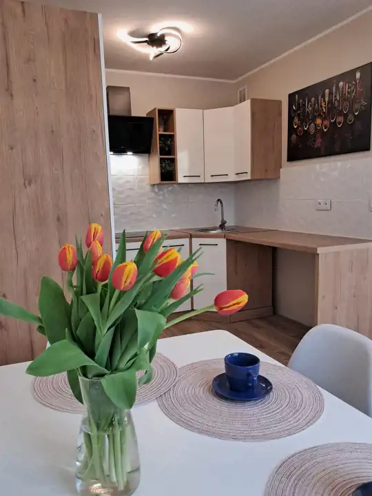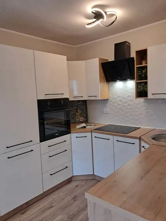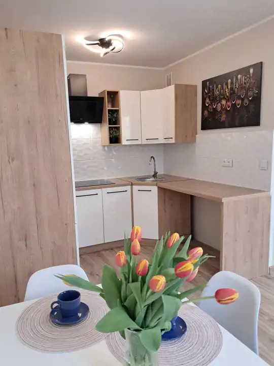 - nowoczesne meble kuchenne w zabudowie (AGD: płyta indukcyjna, okap, piekarnik , miejsce na zmywarkę i pralkę, szafka - słupek na lodówkę w zabudowie)