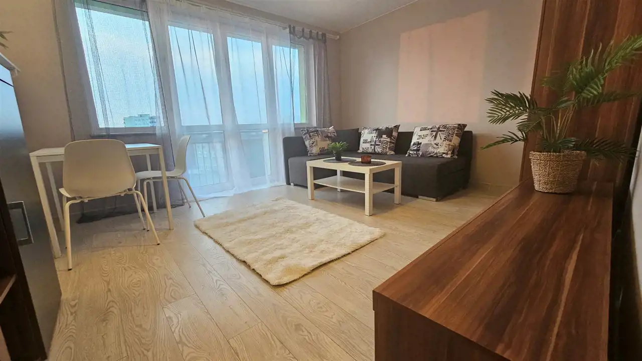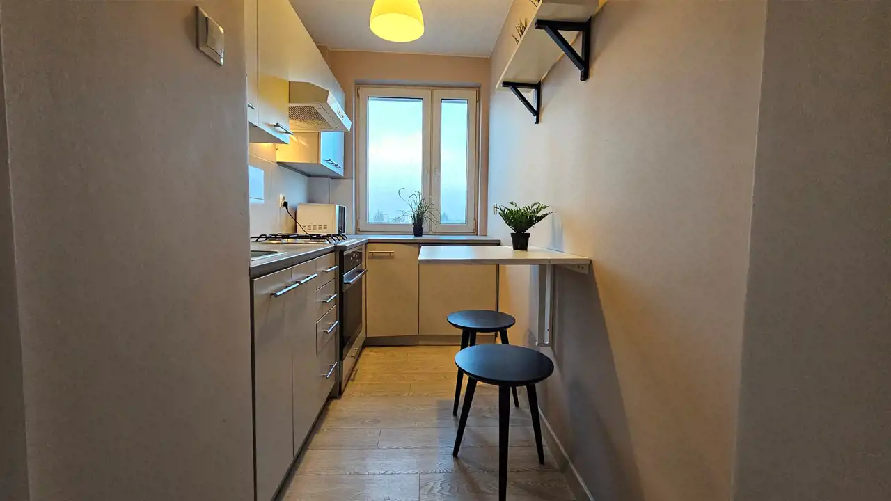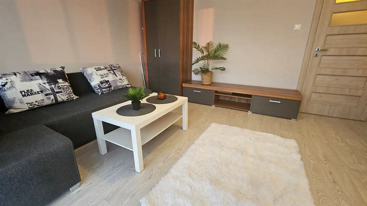W lokalu może pozostać pełne wyposażenie (2 kanapy z funkcją spania, komoda, stół, szafa, meble kuchenne, lodówka, płyta gazowa, piekarnik, pralka, stolik kawowy).