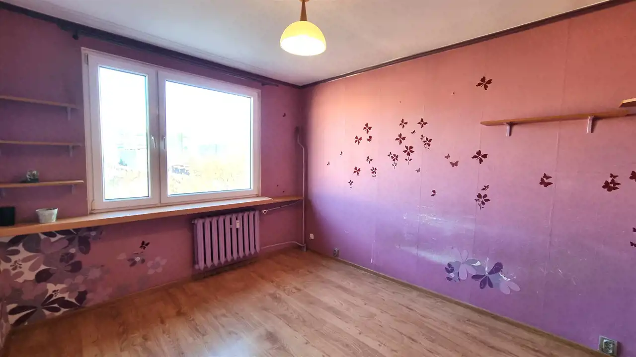 SYPIALNIA: podłoga panele podłogowe, ściany częściowo tapety częściowo malowane, okno PCV