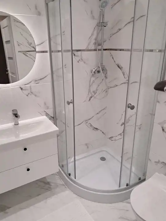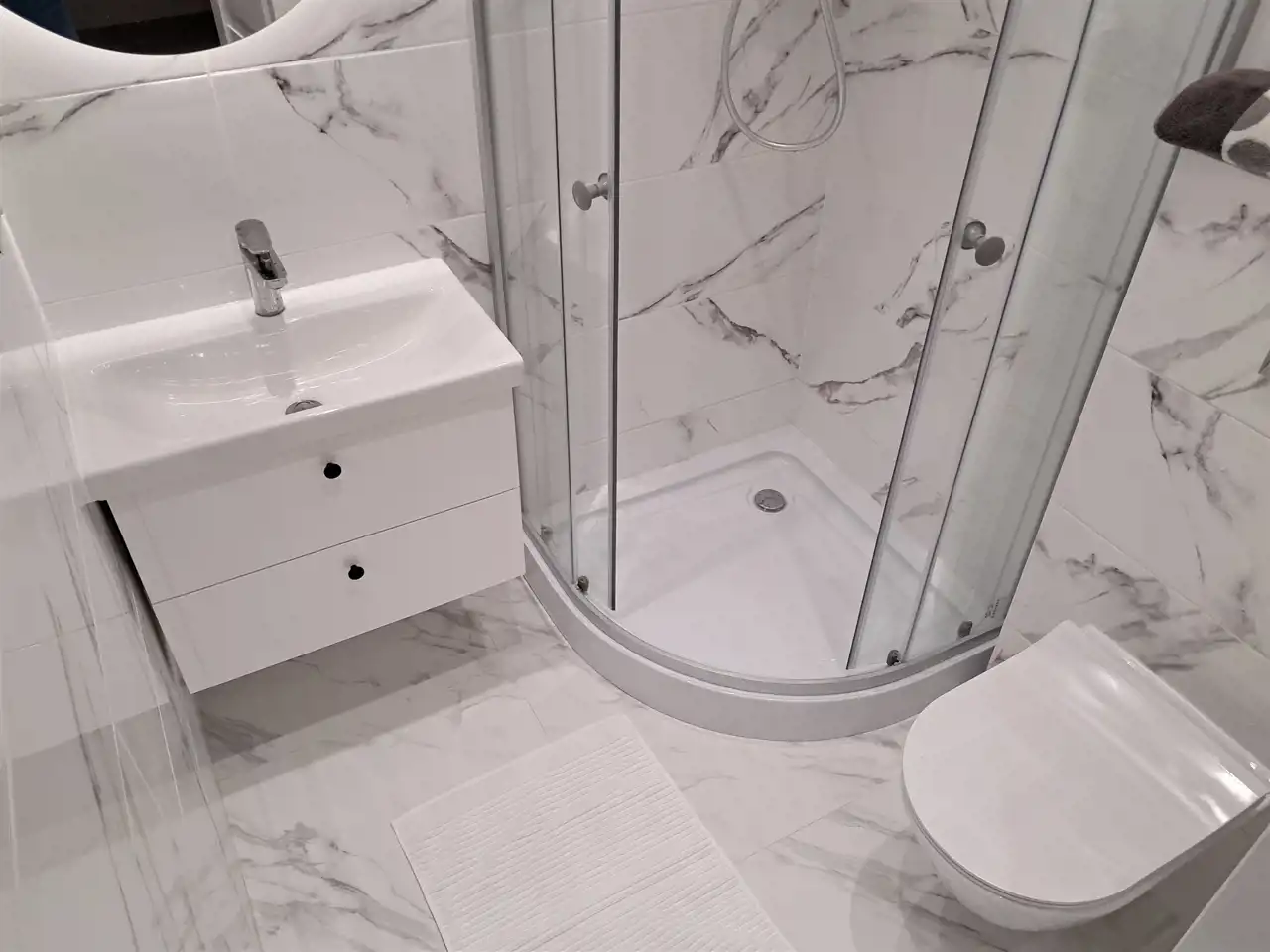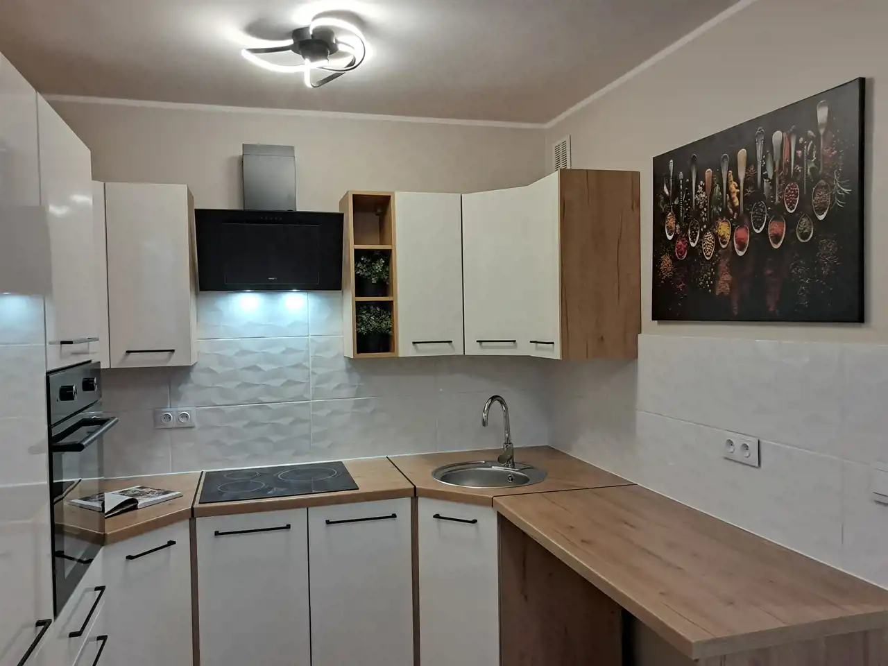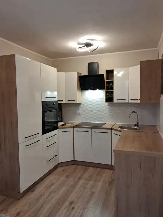 - nowoczesne meble kuchenne w zabudowie (AGD: płyta indukcyjna, okap, piekarnik , miejsce na zmywarkę i pralkę, szafka - słupek na lodówkę w zabudowie)