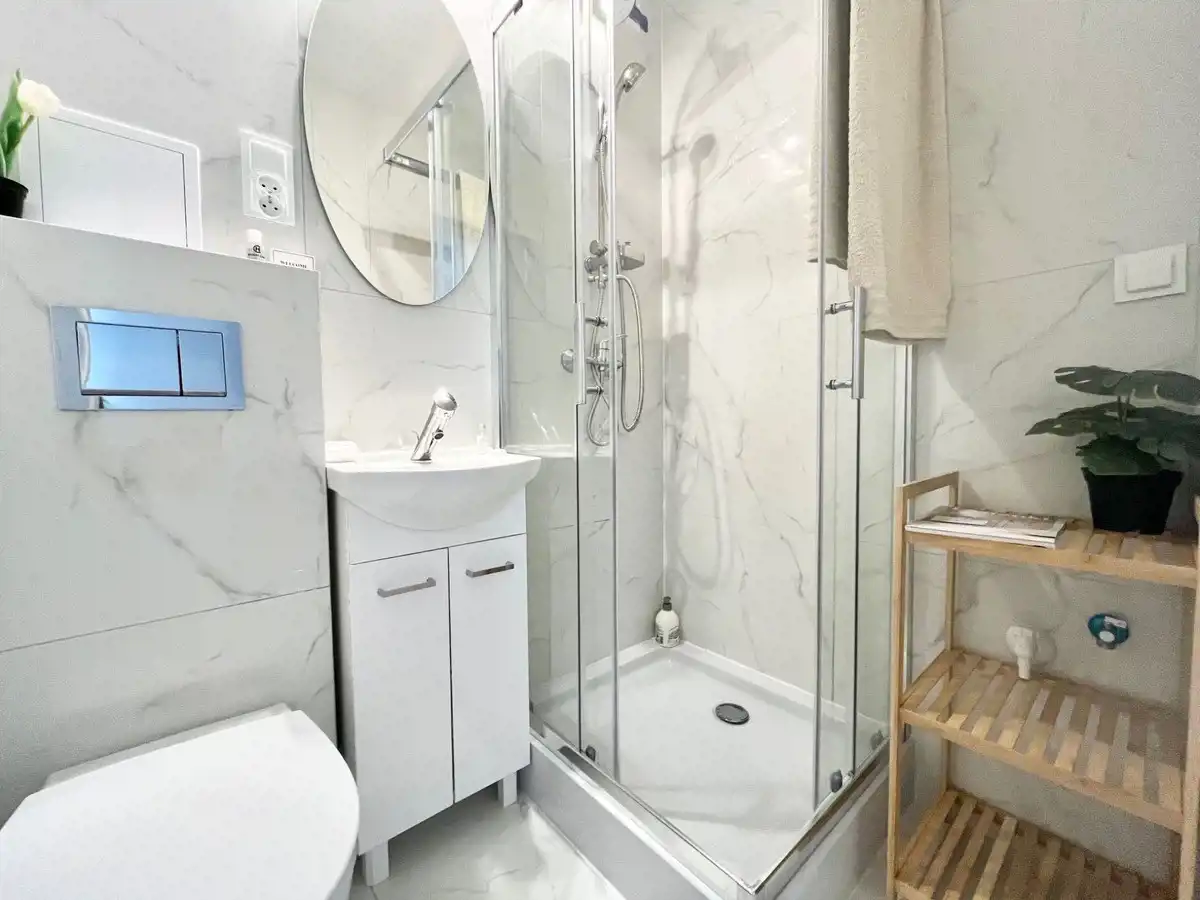 Łazienka: kabina z deszczownicą, umywalka z szafką, duże lustro, gres porcelanowy połysk