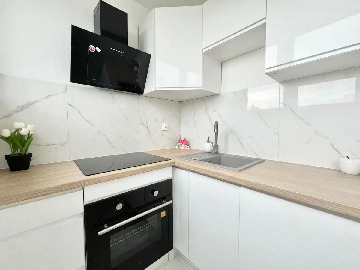 Kuchnia: jasna, umeblowana, meble biały połysk, zlew granitowy, gres; w cenie sprzęty AGD w zabudowie (zmywarka, piekarnik, płyta indukcyjna, okap – nowe, na gwarancji)