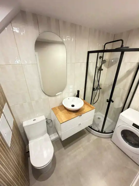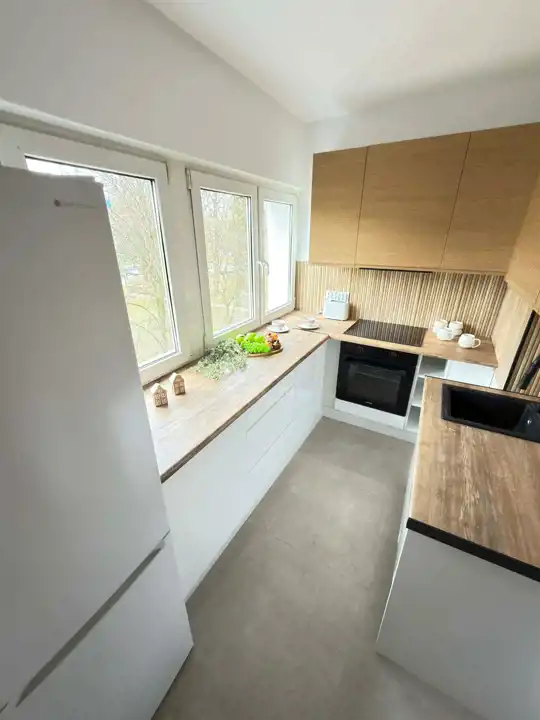 Kuchnia , meble w zabudowie, cały sprzęt AGD na gwarancji, lodówko-zamrażarka , płyta ceramiczna, piekarnik, okap, zmywarka, w łazience pralka