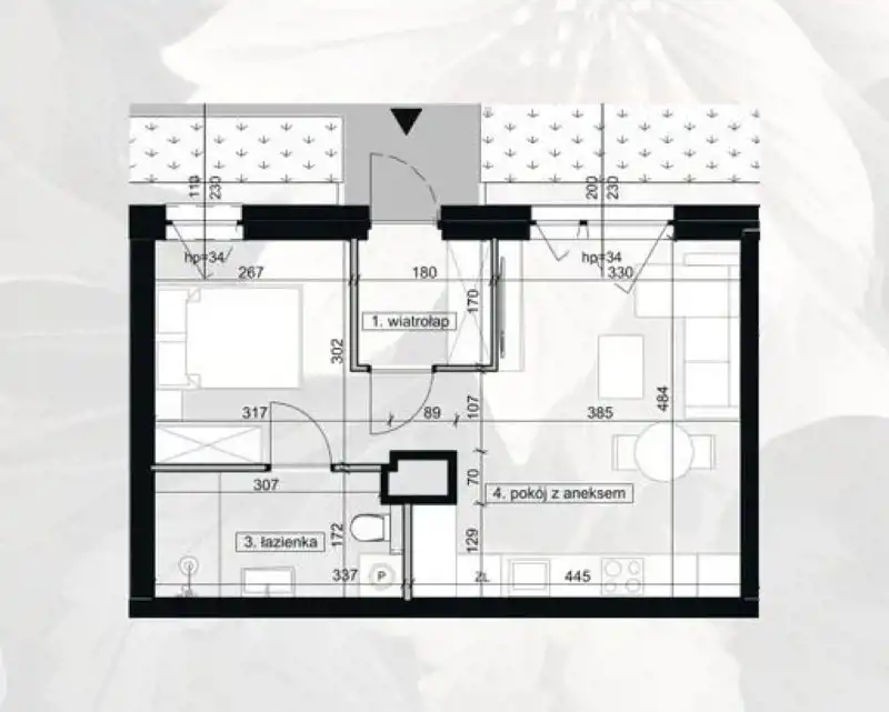 - Charakterystyka mieszkania 36.45 m2, 2 pokoje