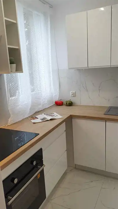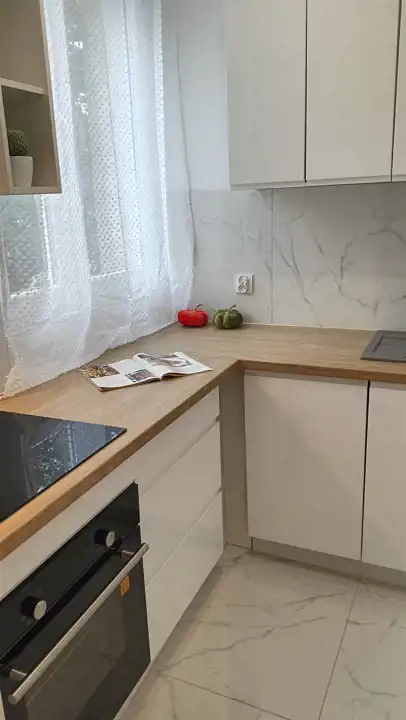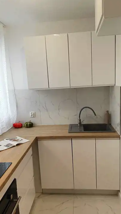 Łazienka utrzymana w jasnej tonacji wyposażona w wannę z deszczownicą, idealne miejsce na szybki poranny prysznic jak i wieczorną relaksującą kąpiel. Kuchnia kompaktowa, lecz w pełni funkcjonalna -nowoczesne meble z połyskiem nie tylko pięknie się prezentują, ale także praktycznie zatrzymują zabrudzenia, co ułatwia utrzymanie czystości.