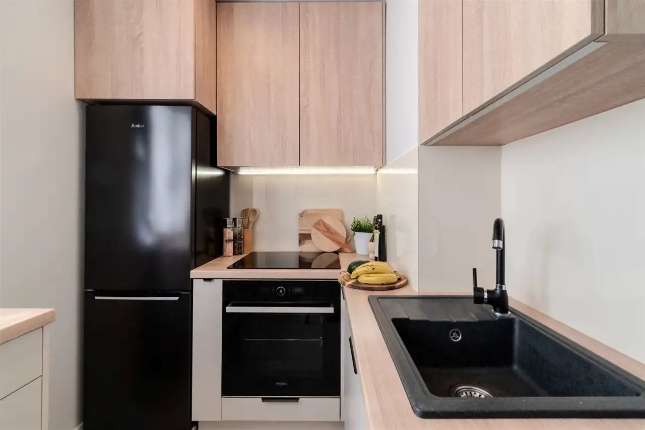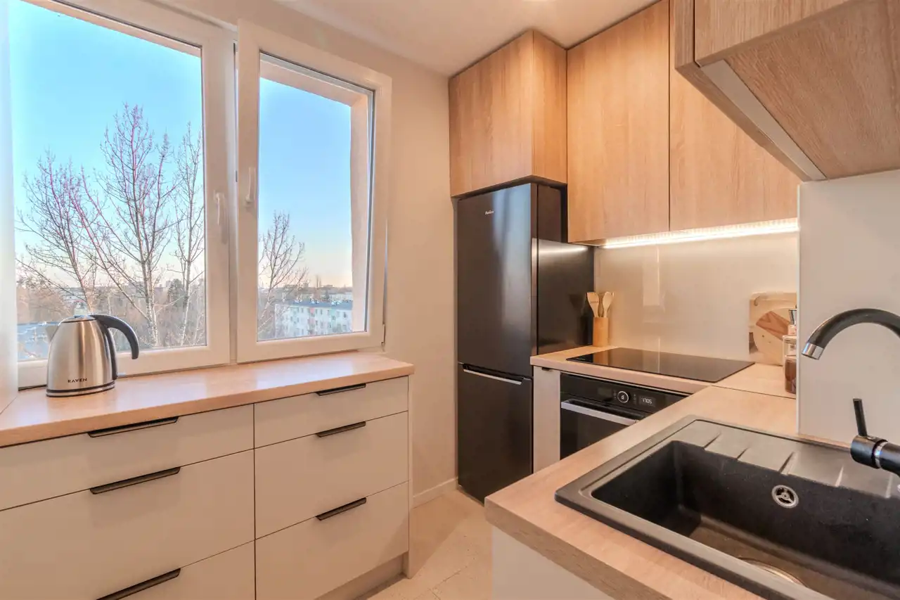 PEŁNE, SPRAWDZONE WYPOSAŻENIE: Wchodzisz i mieszkasz. Kuchnia w zabudowie, nowoczesne oświetlenie, stylowe dodatki – wszystko, co widzisz na zdjęciach, działa i może być Twoje. Bez niespodzianek.