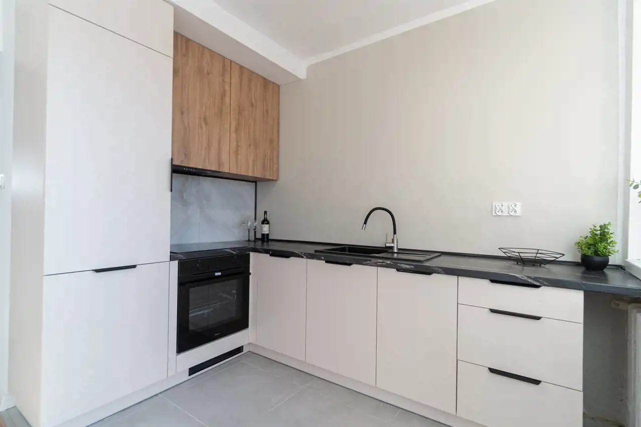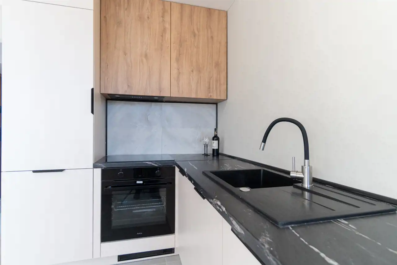 - Kuchnia: Meble wykonane pod wymiar oraz nowy sprzęt AGD (płyta, piekarnik, okap)