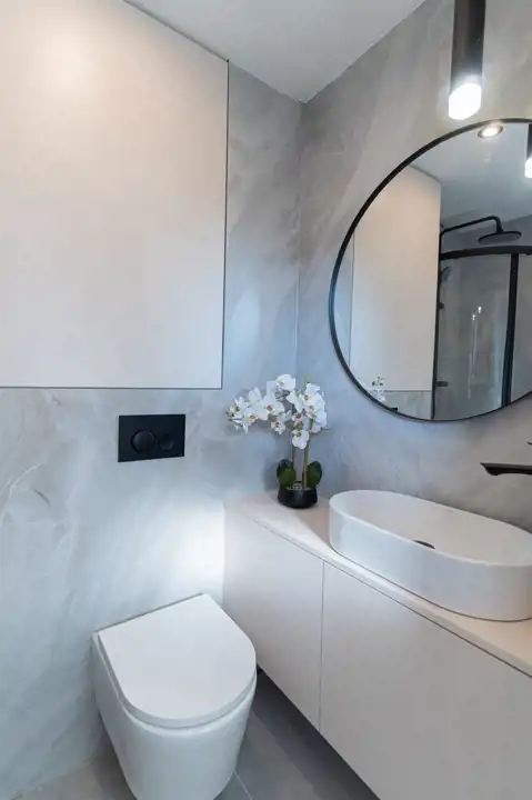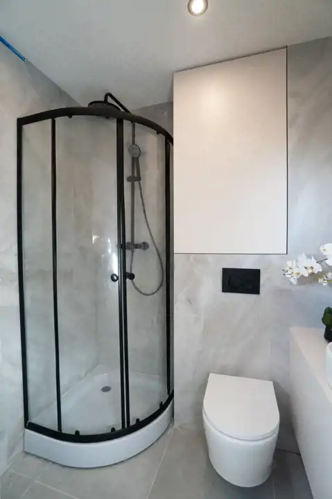 - Łazienka: W pełni wyposażona, z elegancką szafką z umywalką, prysznicem, WC i miejscem na pralkę.