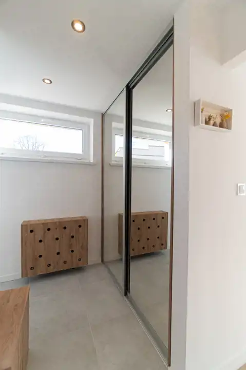 - Przedpokój: Szafa w zabudowie z lustrami, szafka na obuwie.