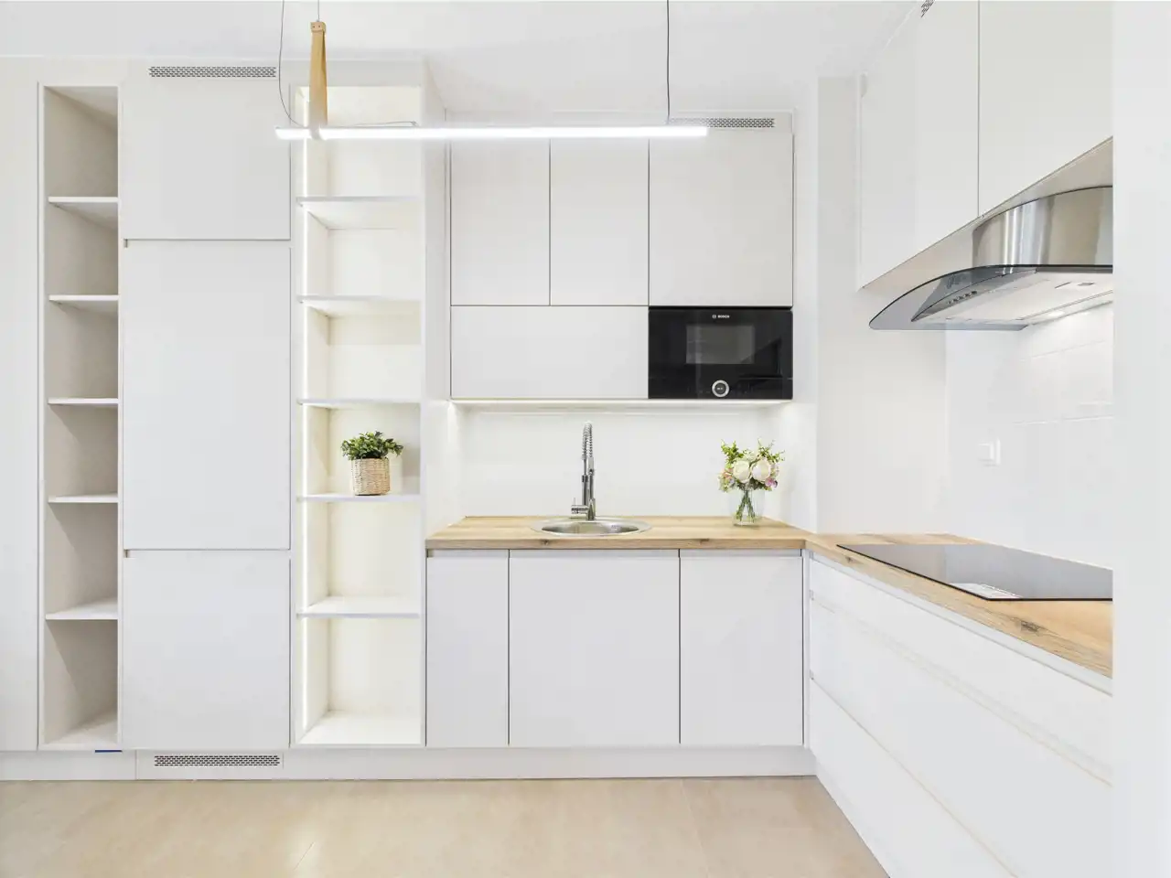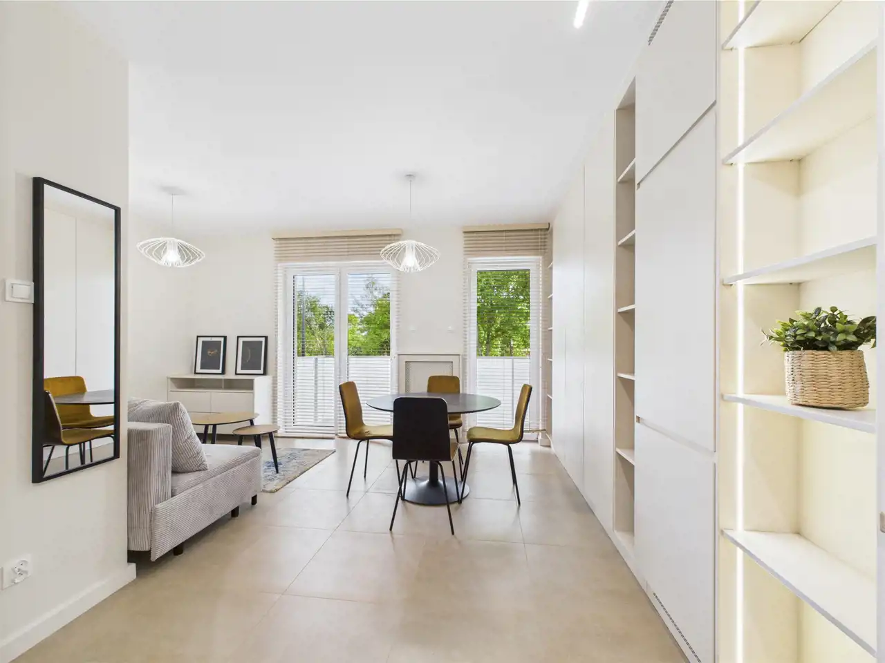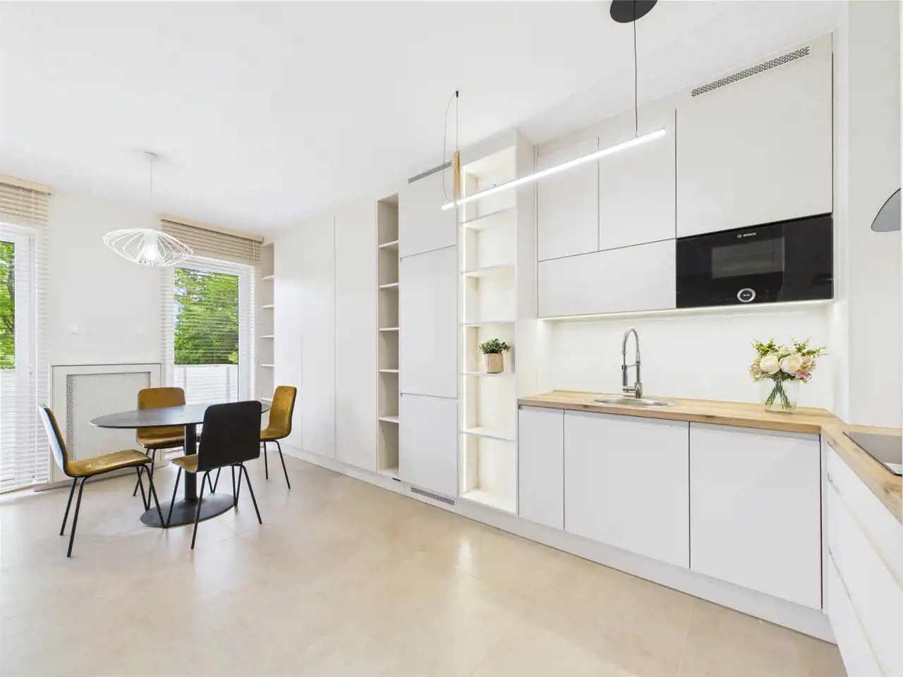 Elegancja spotyka się tu z funkcjonalnością – meble i stolarka wykonane na wymiar tworzą spójną, stylową przestrzeń, a liczne szafy w zabudowie zapewniają mnóstwo miejsca do przechowywania. Wnętrze jest w pełni umeblowane i wyposażone w nowoczesne, nowe AGD, co gwarantuje komfort codziennego użytkowania.