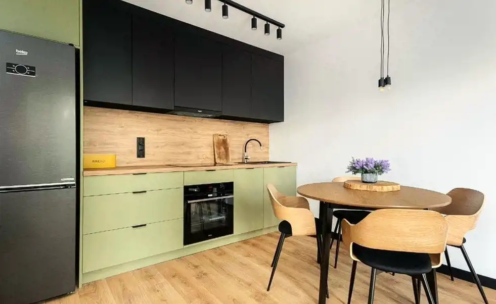 Całość znajdującego się w aneksie kuchennym sprzętu AGD jest fachowo zabudowana meblami na wymiar w modnych kolorach mięty i czerni, na zawiasach Blum.