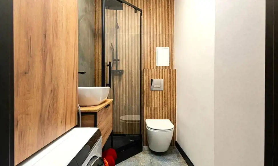 Wyposażenie stanowią: kabina natryskowa, umywalka i pralkę automatyczna. Wyposażenie łazienki jest nowoczesne, gustowne, spójne w klimacie z resztą mieszkania.