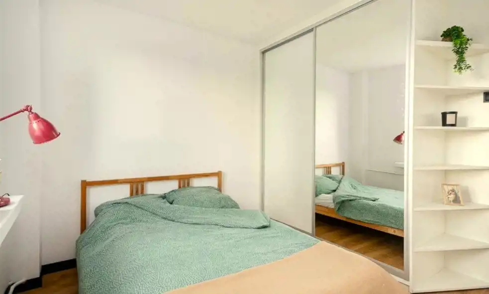 Wyposażenie stanowią: duża szafa wnękowa, półki, lampki nocne i duże łoże małżeńskie.