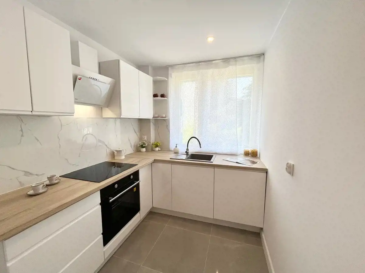 - kuchnia jasna, osobna, meble w białym połysku, zlew granitowy, sprzęt AGD w zabudowie (zmywarka, piekarnik, płyta indukcyjna, okap – nowe, na gwarancji)