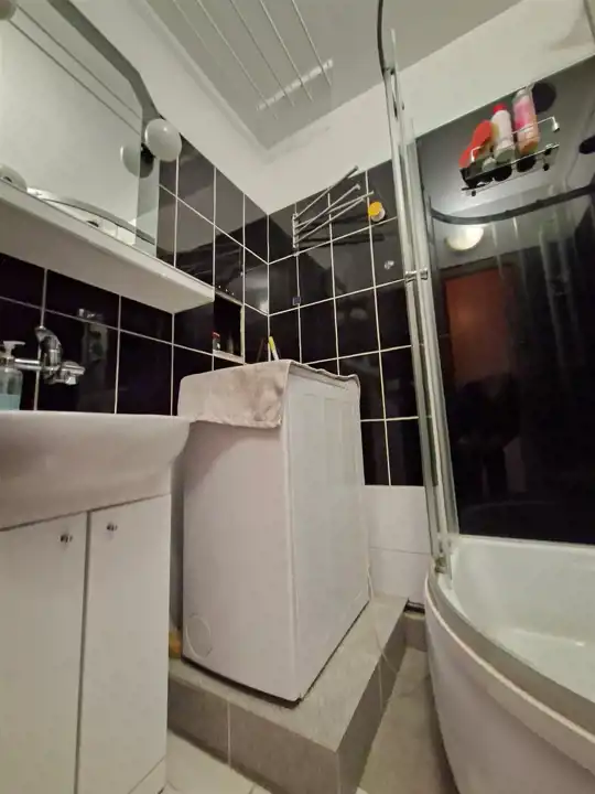 Łazienka- kabina prysznicowa, umywalka, pralka.