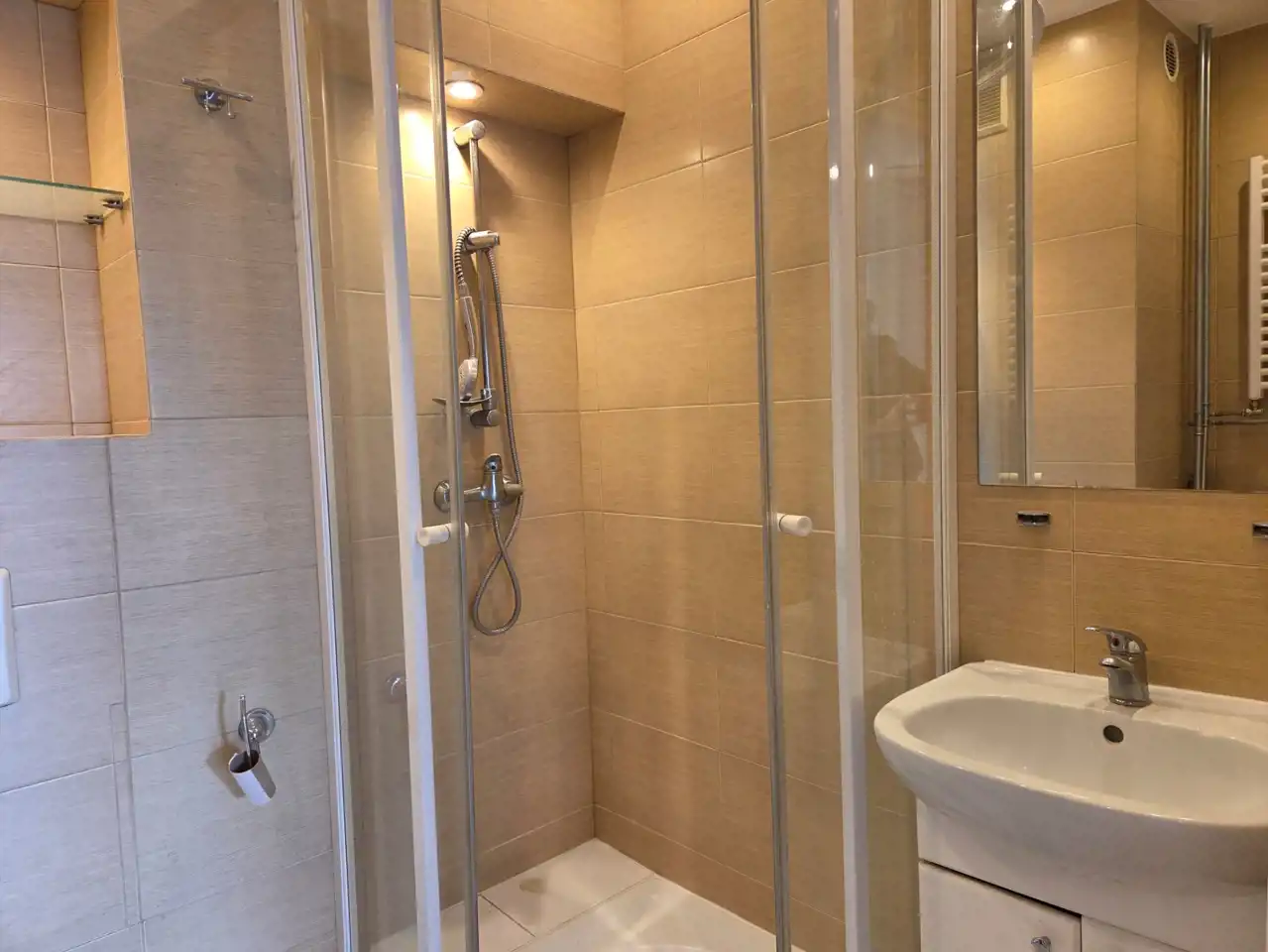 - łazienka o powierzchni ok. 3,5 m2 z prysznicem, umywalką i WC,