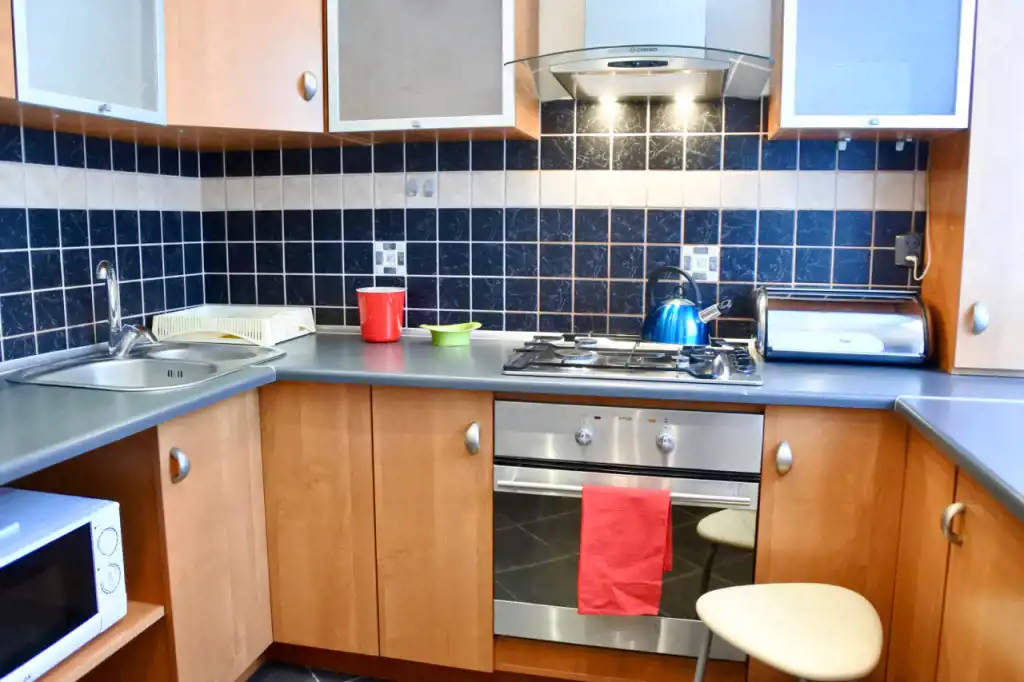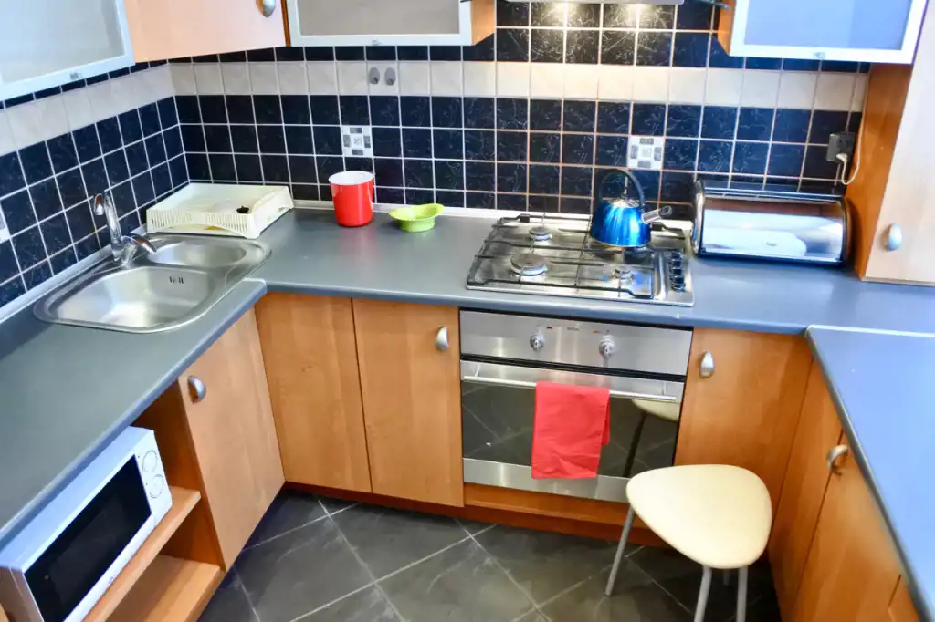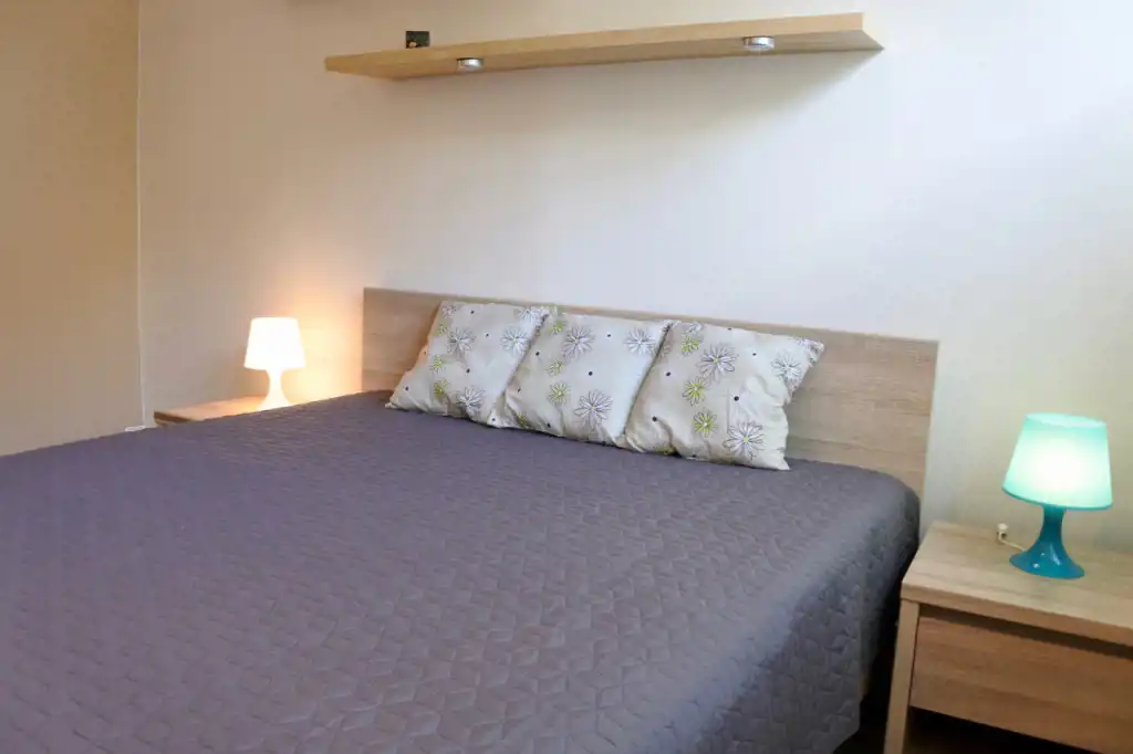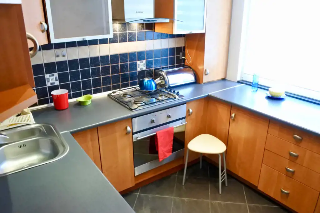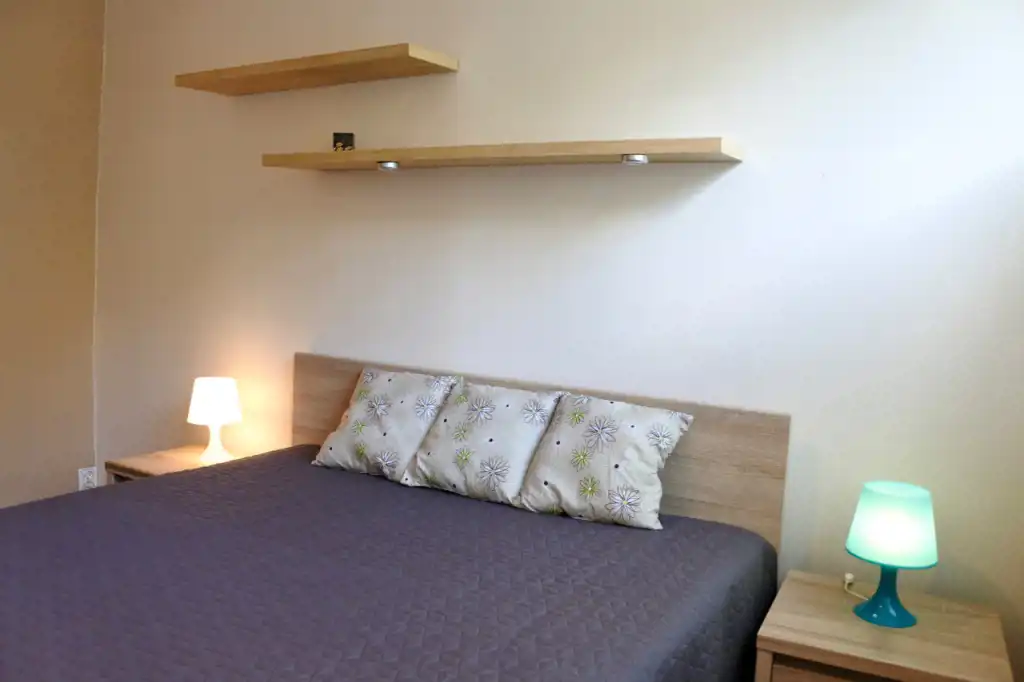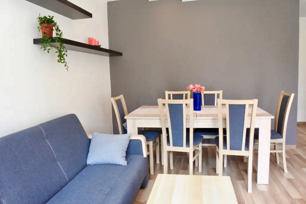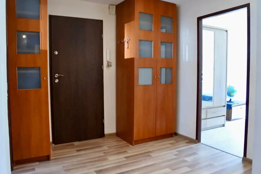 Lokal składa się z przestronnego całkowicie urządzonego otwartego pokoju dziennego (pomieszczenie bez drzwi - rozkładana kanapa, fotel, stół, krzesła, niskie komody i niski stolik), sypialni (łóżko 2-osobowe, szafki nocne, zabudowana szafa pod wymiar na całej ścianie), pokoju gościnnego (łóżko 1-osobowe, duża szafa, fotel, niska szafka), kuchni, łazienki, toalety i holu. Kompletne wyposażenie kuchni - płyta gazowa, piekarnik, lodówka, pochłaniacz, mikrofala. Łazienka z wanną, umywalką, pralką, półkami i szafkami. Toaleta osobno. W przedpokoju dwie szafy i wieszaki.