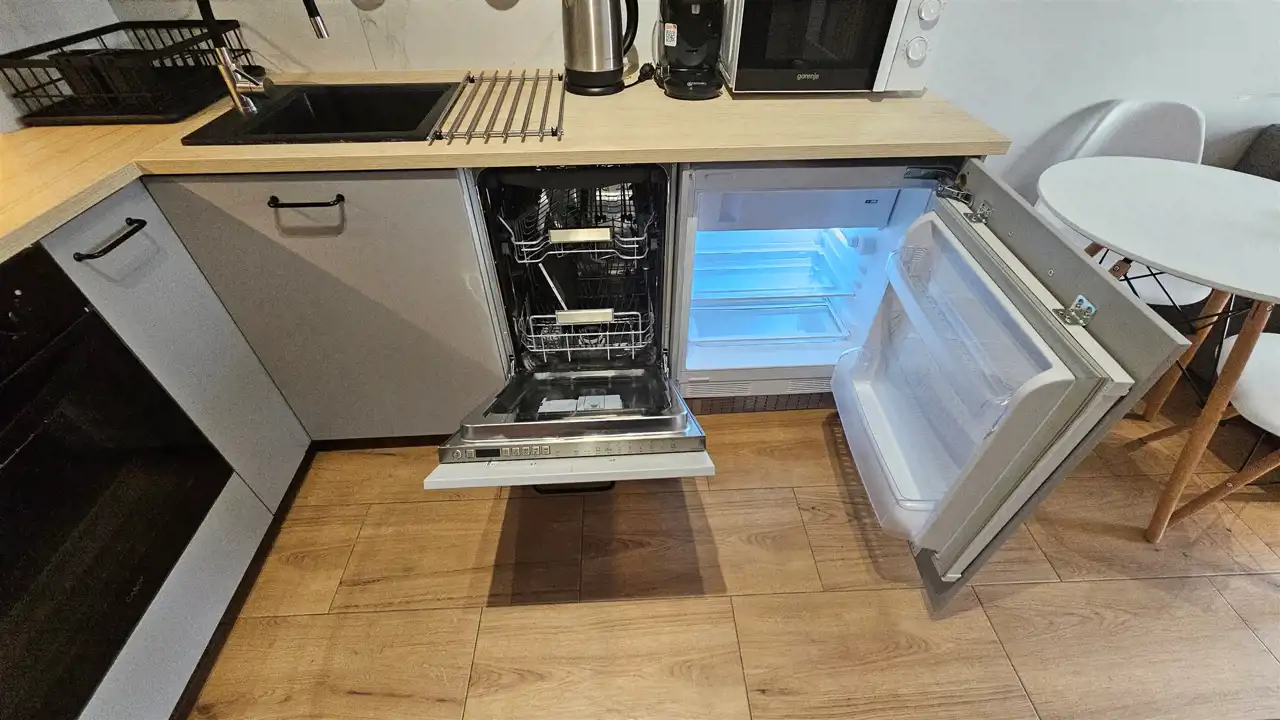 - salonu z aneksem kuchennym (szafki kuchenne, lodówka, płyta indukcyjna, zmywarka, piekarnik),