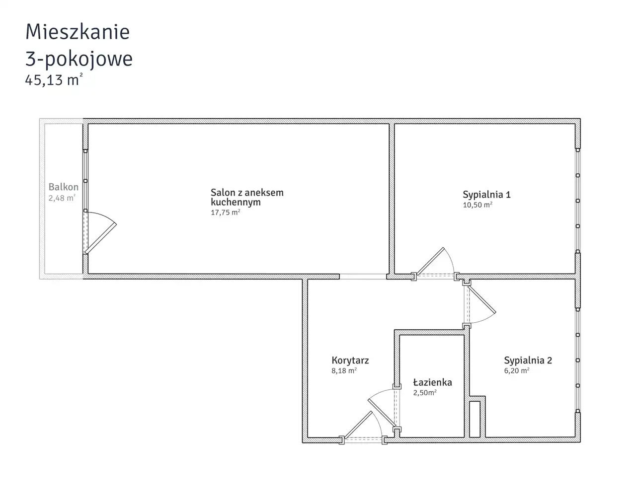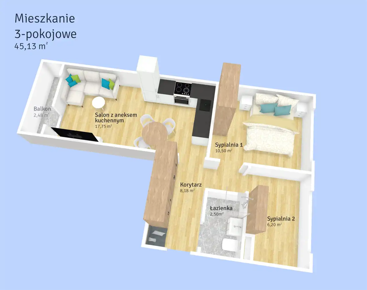 - Charakterystyka mieszkania 45.13 m2, 3 pokoje