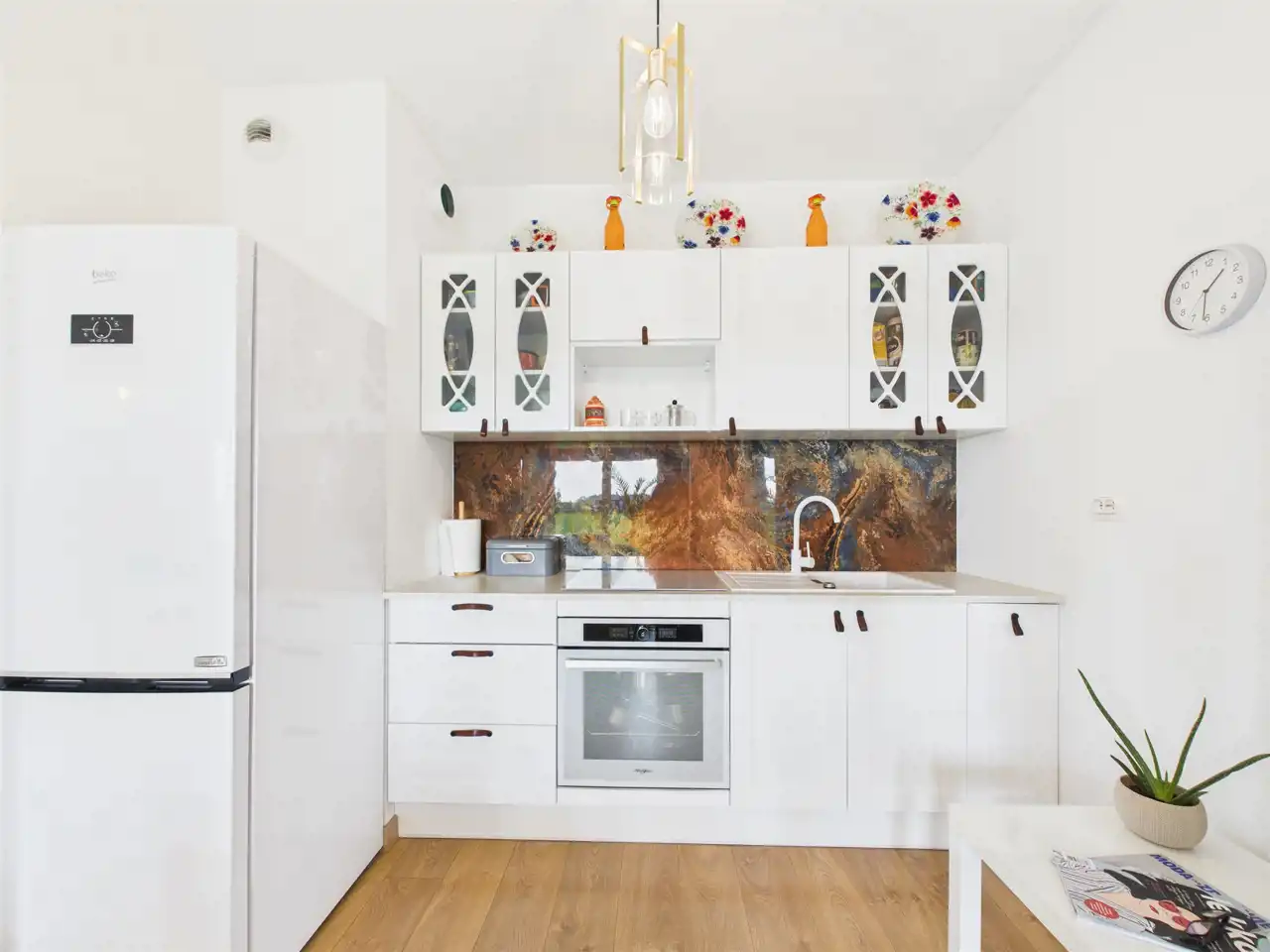 Elegancja spotyka się tu z funkcjonalnością – meble tworzą spójną, stylową przestrzeń, a liczne szafy zapewniają mnóstwo miejsca do przechowywania. Wnętrze jest w pełni umeblowane i wyposażone w nowoczesne, nowe AGD, co gwarantuje komfort codziennego użytkowania.