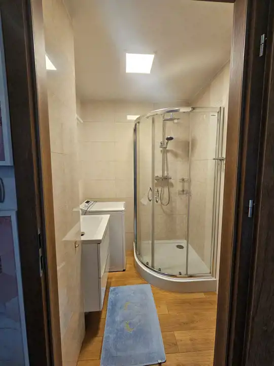 Łazienka i toaletą są osobno - jest tutaj Nowoczesna glazura. A w toalecie jest umywalka.