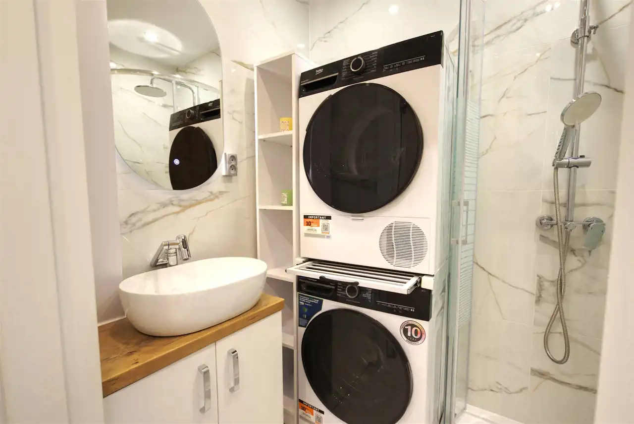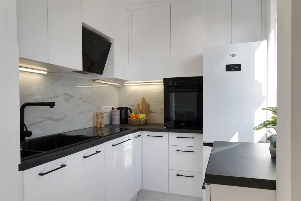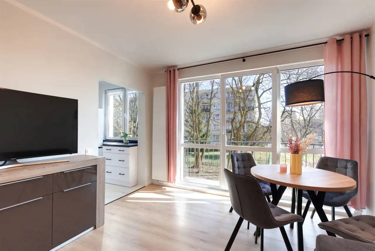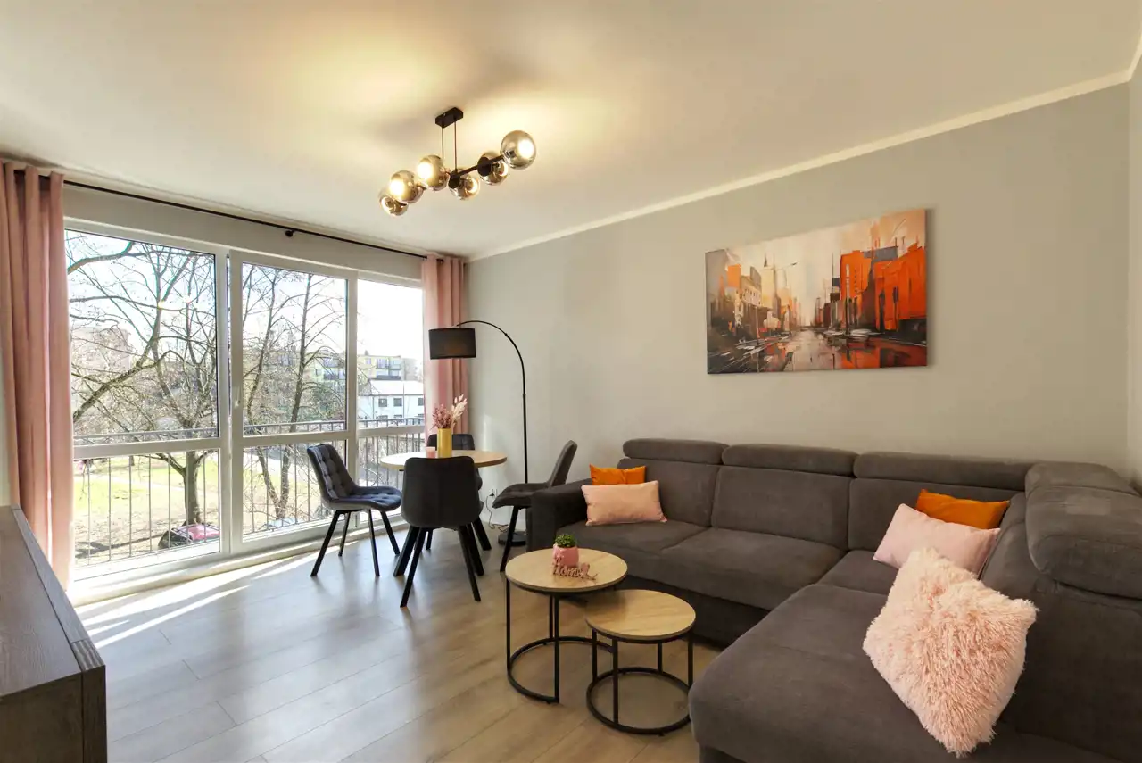 Wnętrza zachwycają spójną stylistyką – od progu czuć harmonię kolorystyczną i materiałową. Mieszkanie jest w pełni umeblowane i wyposażone w sprzęt AGD/RTV (w tym pralka i suszarka), który został zakupiony pod koniec 2025 roku, co oznacza, że wszystkie urządzenia są wciąż na gwarancji.
