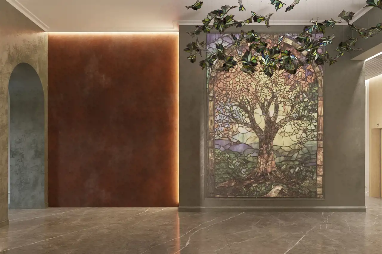 Przeszklona winda – centralny punkt budynku, widoczna z każdej kondygnacji.