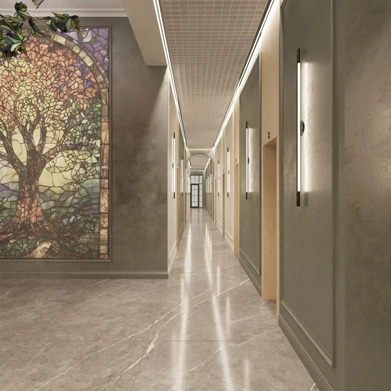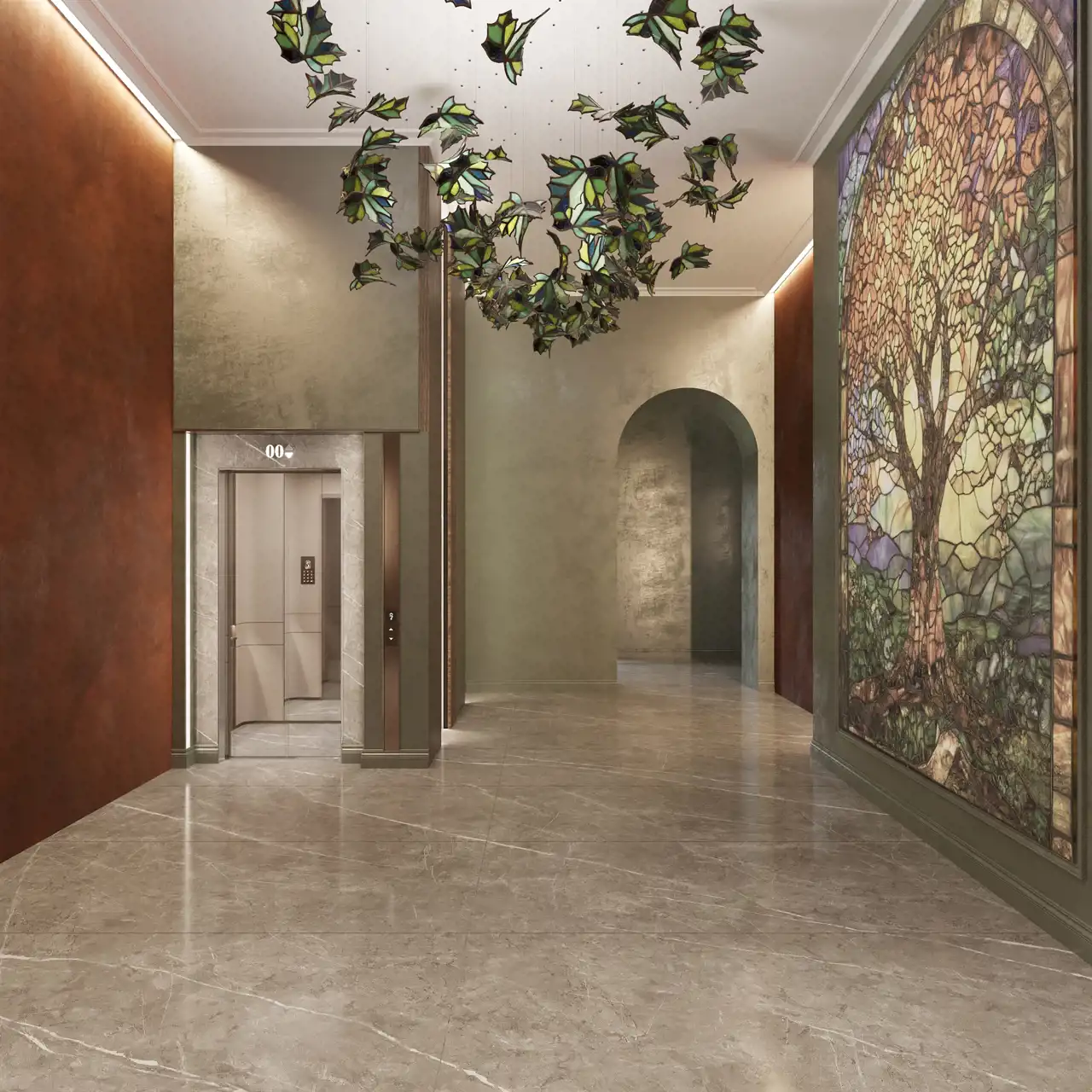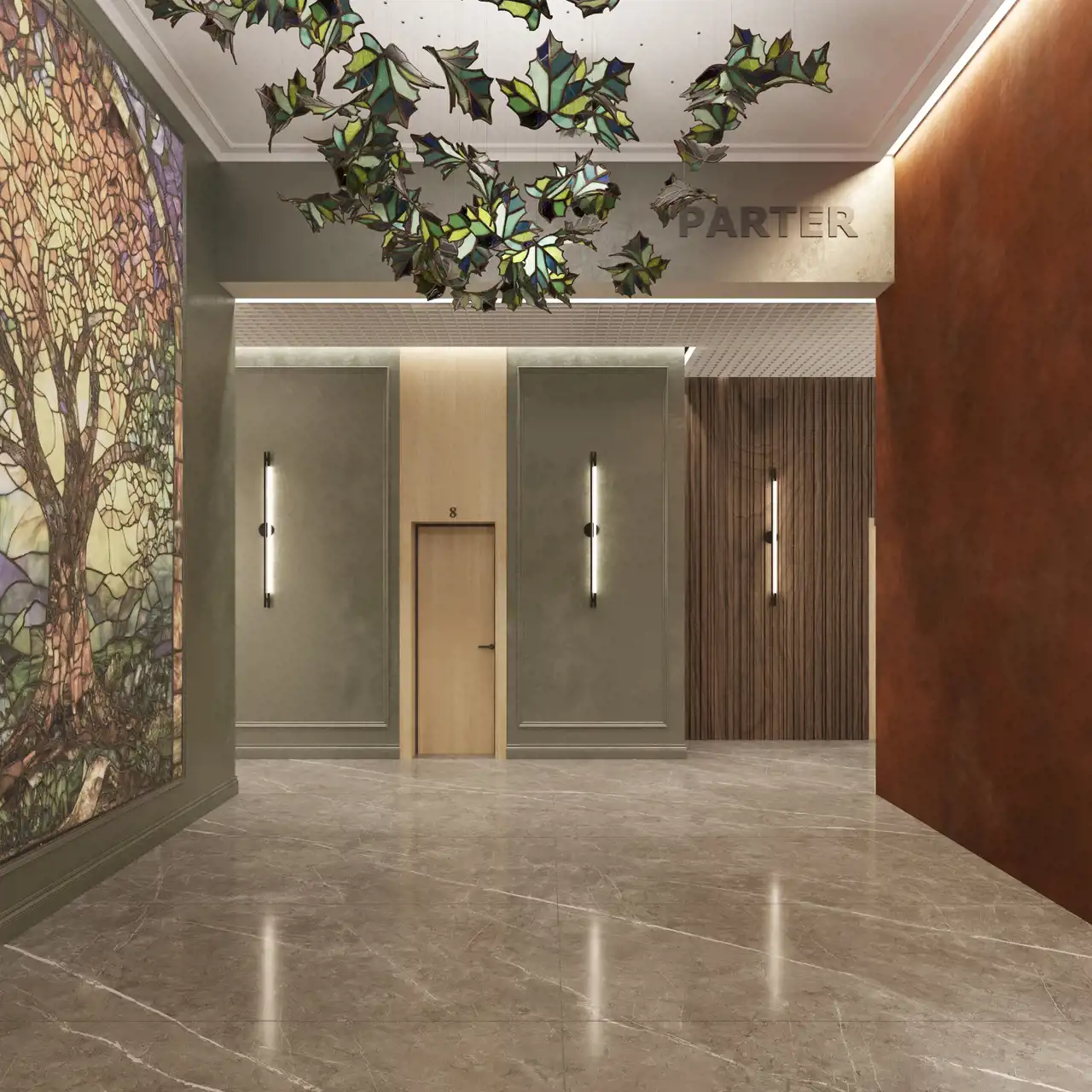 Przeszklona winda – centralny punkt budynku, widoczna z każdej kondygnacji.