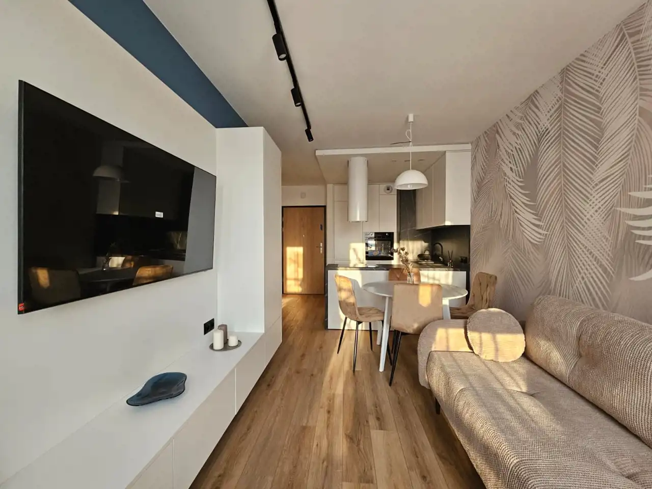 - salon z aneksem kuchennym i strefą jadalnianą,