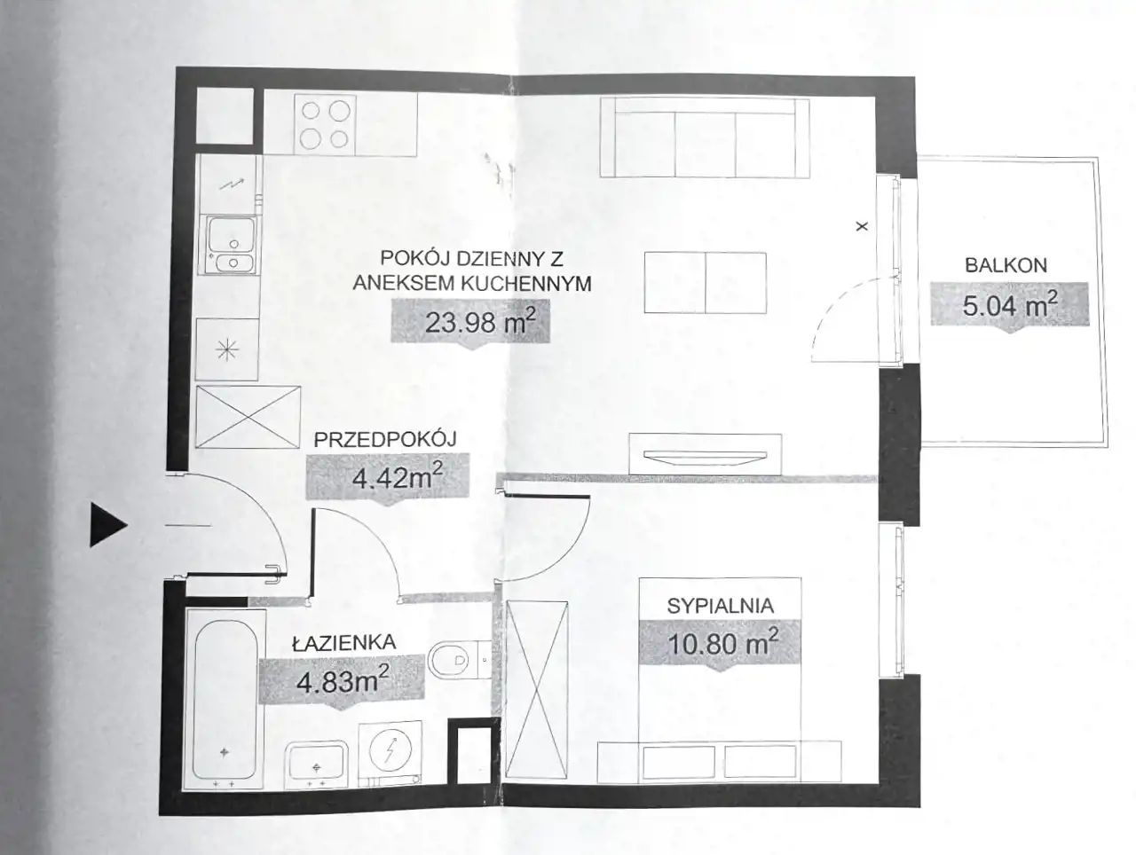 - mieszkanie składa się z salonu z aneksem kuchennym o pow. ok. 23,98 2, sypialni o pow 10,80 m2, łazienki razem z WC o pow. 4,83 m2, balkonu o pow. ok 5,04 m2,