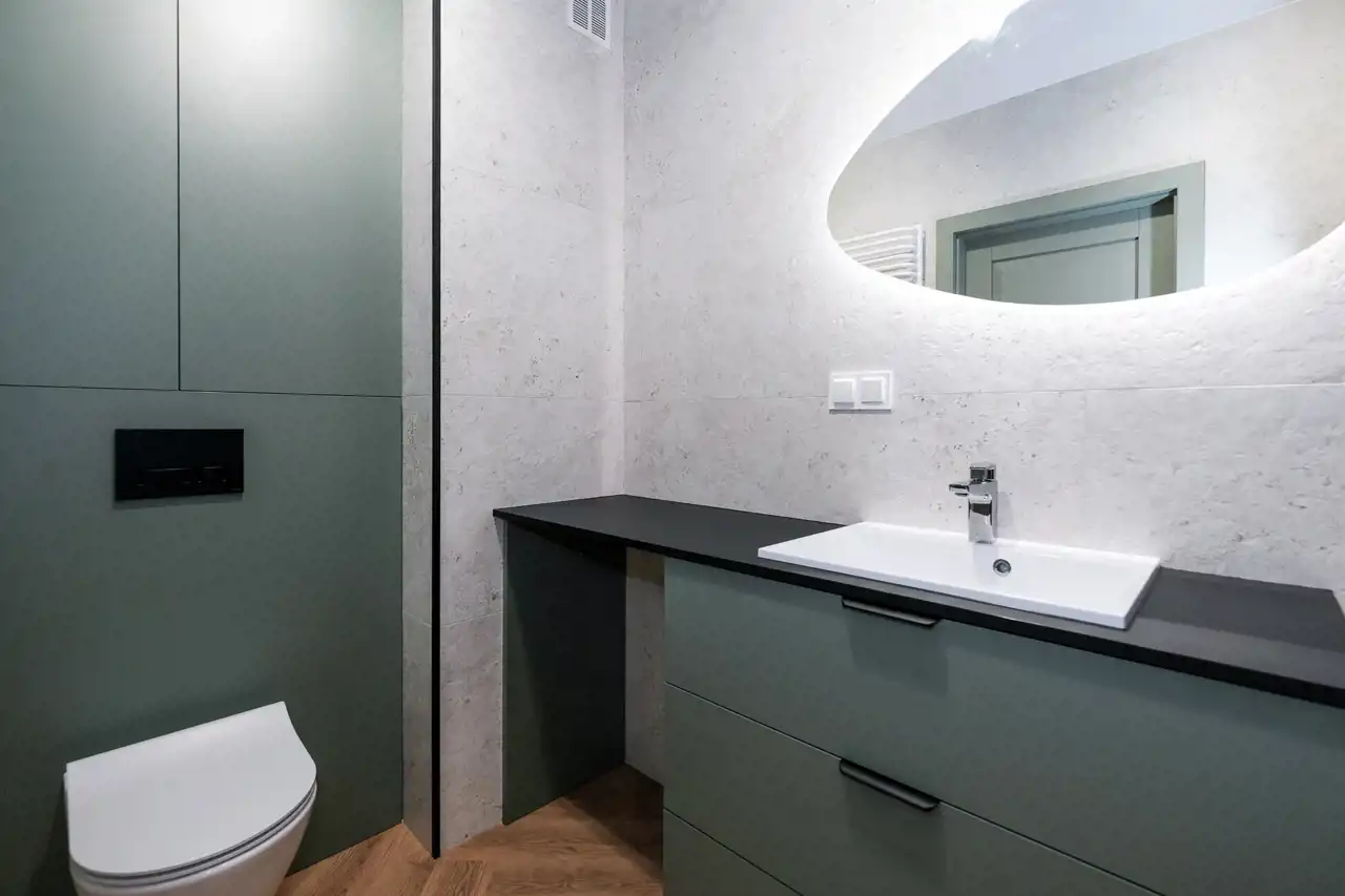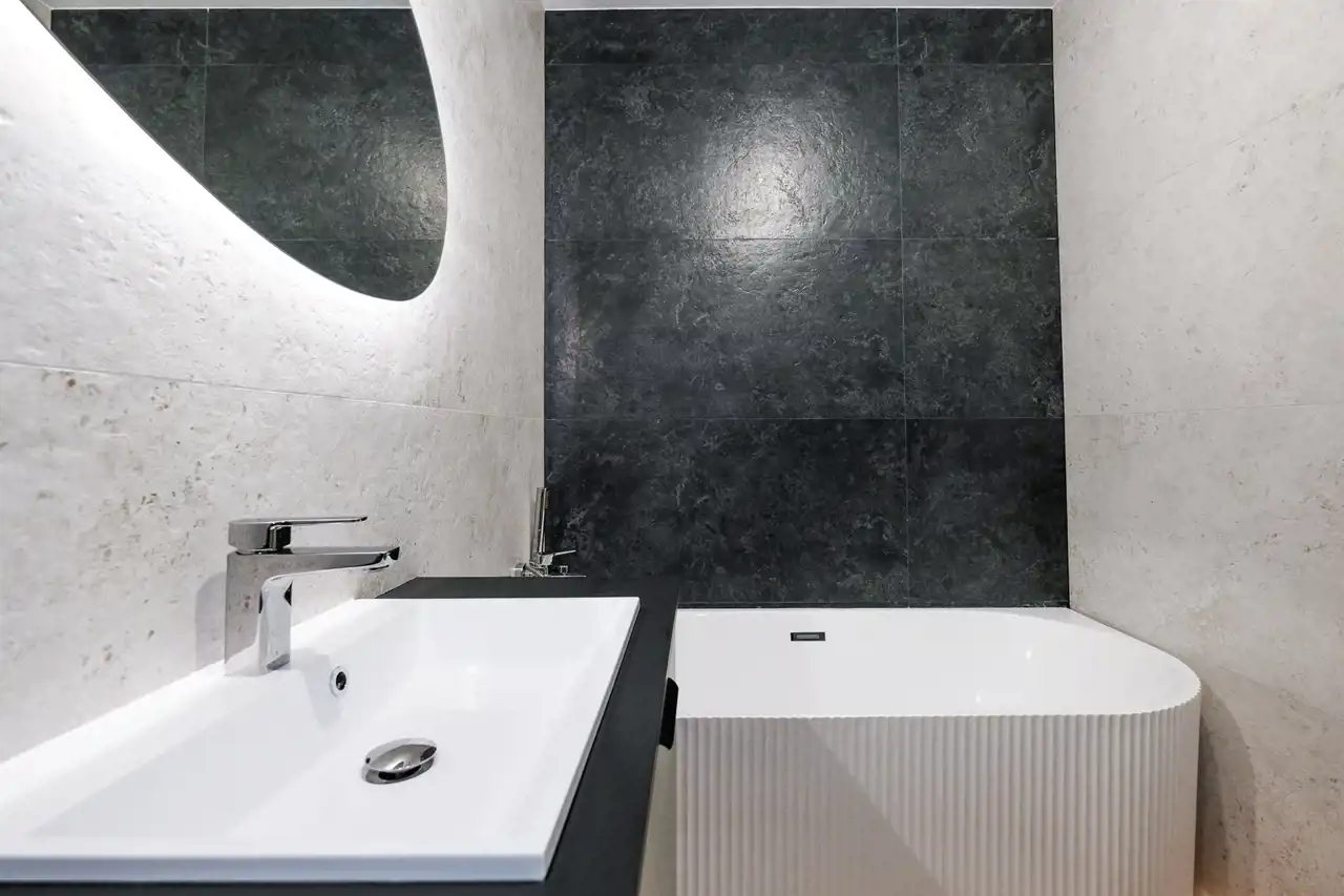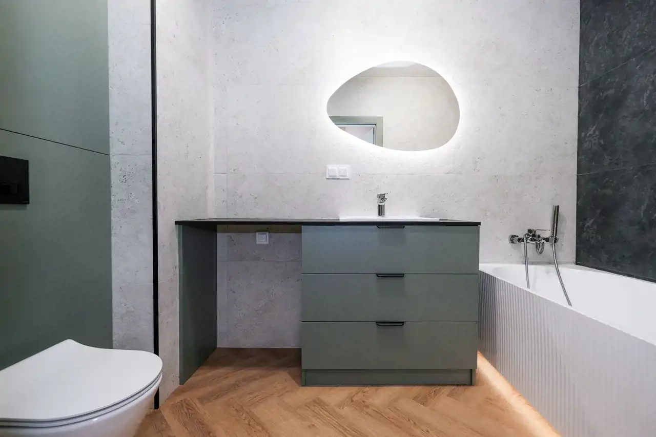 - w łazience glazura i terakota, nowoczesna, wpisująca się w trendy wanna z podświetleniem led, zabudowy meblowe,