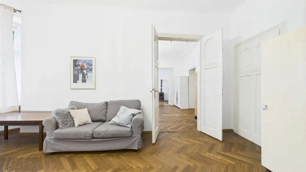 Mieszkanie znajduje się w bocznym skrzydle budynku – okna wychodzą na wewnętrzne podwórze, co gwarantuje ciszę i spokój mimo centralnej lokalizacji. Dostęp przez zamykany korytarz dzielony tylko z jednym sąsiadem.