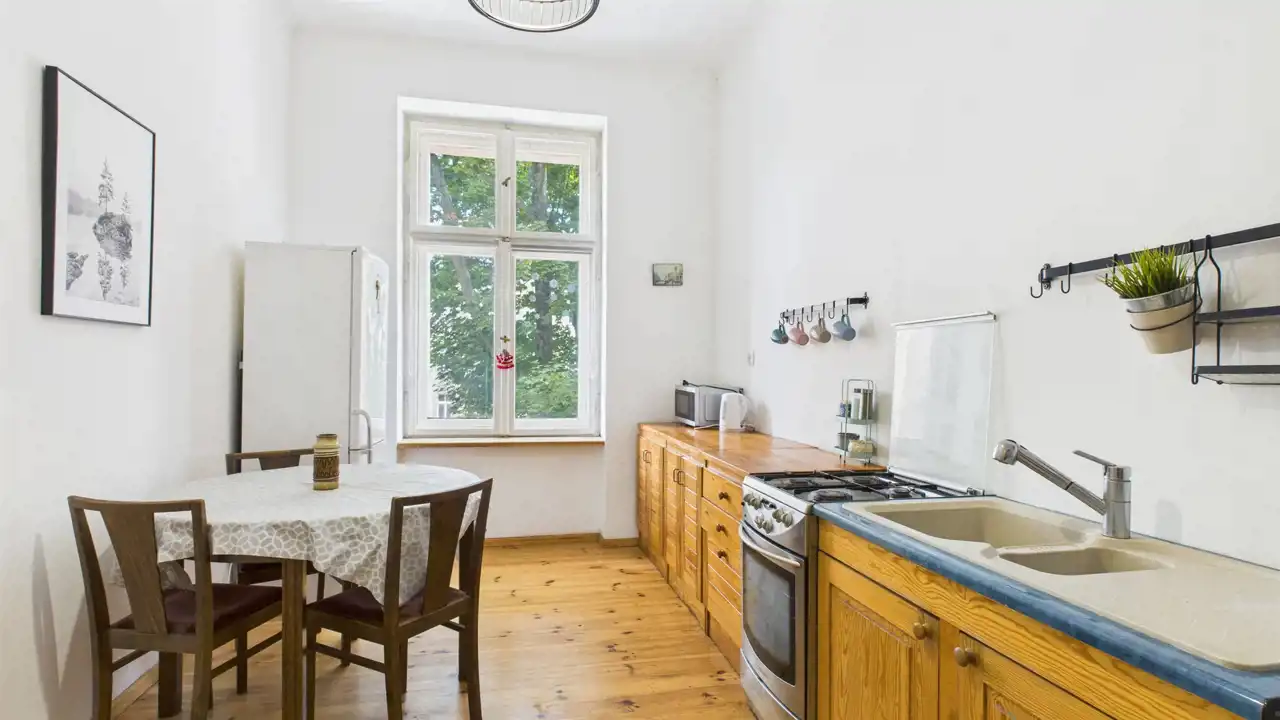 Stylowe 2-pokojowe mieszkanie o niepowtarzalnym klimacie, położone w odrestaurowanej kamienicy. Wysokie sufity, oryginalny drewniany parkiet, klasyczne futryny, sztukateria i duże drewniane okna – wszystko to nadaje wnętrzu wyjątkowy charakter.