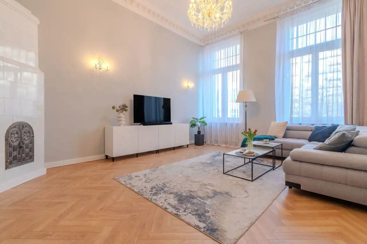 W mieszkaniu są oryginalne sztukaterie i unikatowy piec kaflowy.