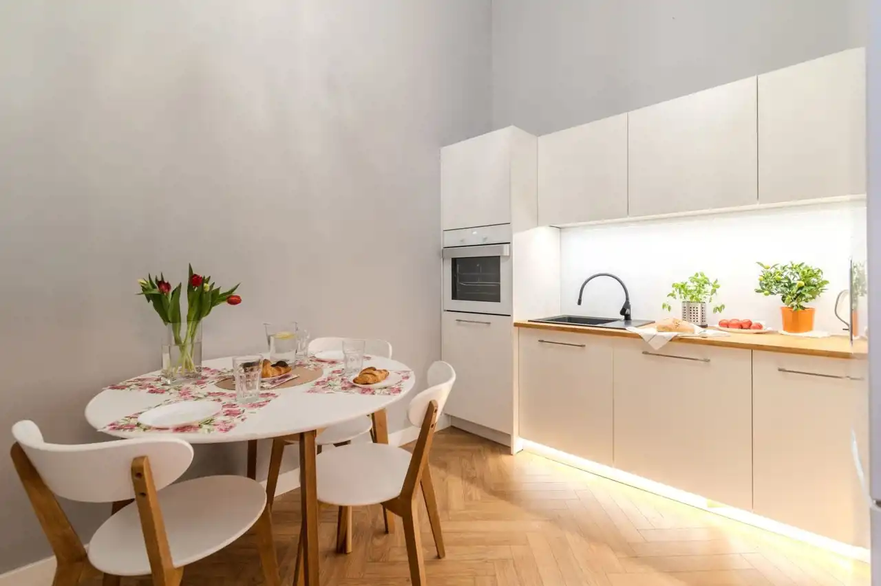 Kuchnia: meble - zabudowa na wymiar, stół okrągły, krzesła, zmywarka, piekarnik, płyta indukcyjna, lodówka z podajnikiem wody, zastawa stołowa, garnki.