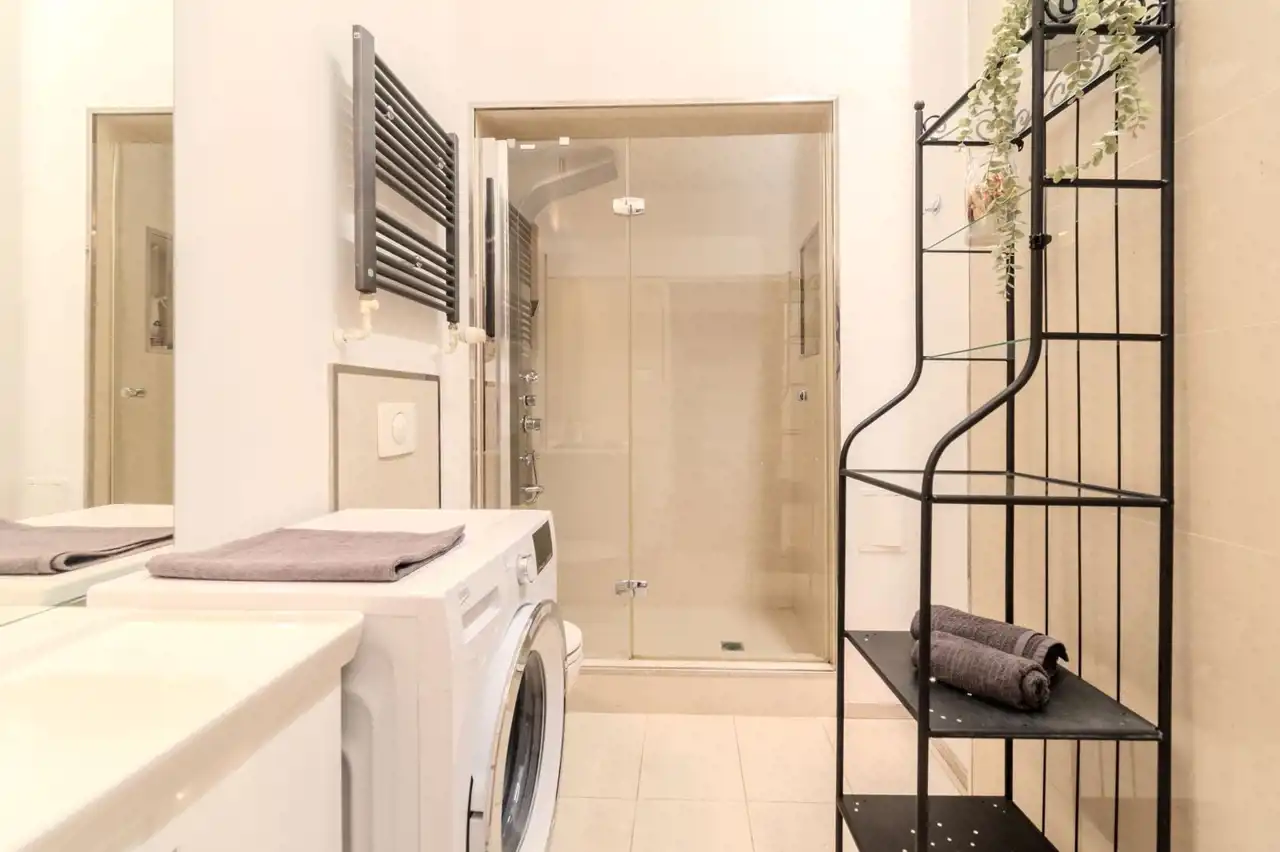 Łazienka: duża kabina natryskowa, pralka, umywalka z szafką, lustro, regał.