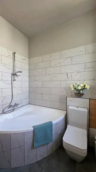 Wspólna przestrzeń jest połączona i komfortowa, kuchnia (ok.10 m2) stanowi centrum komunikacyjne z salonem, łazienką i balkonem. W każdym pomieszczeniu jest duże okno, również w łazience. W salonie (18 m2) jest okno na podwórko w kierunku zachodnim. Łazienka jest przestronna z narożną wanną.