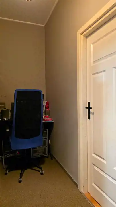 Z przedpokoju po lewej stronie jest wejście do 2 sypialni (z pięknymi, dużymi oknami w kierunku wschodnim, 13 i 12 m2) oraz wydzielone miejsce do pracy (w którym jest nie tylko biurko ale również duży regał).