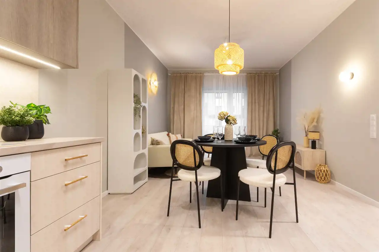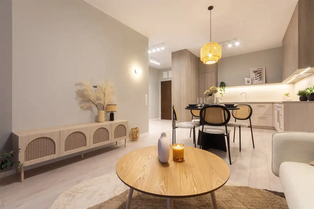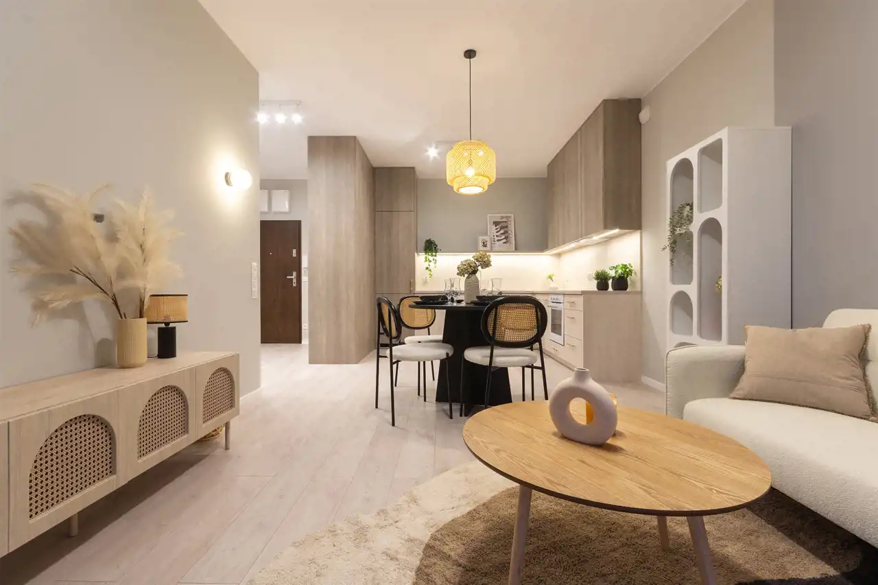• Przestronny salon z aneksem kuchennym: Miejsce, gdzie można swobodnie wypoczywać i cieszyć się wspólnym czasem z rodziną i przyjaciółmi. Kuchnia wyposażona w nowe sprzęty AGD.