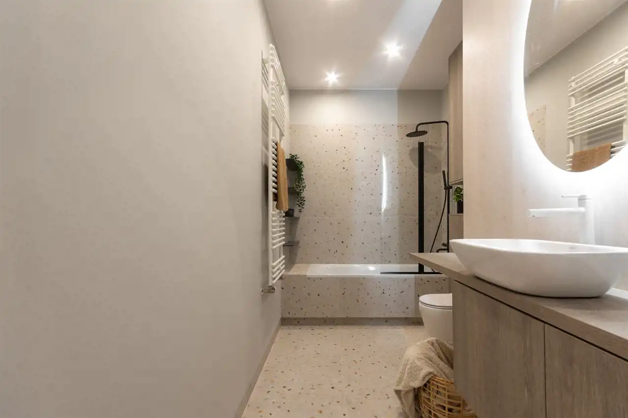 Naturalne materiały i jasne, ciepłe kolory, które tworzą unikalny klimat wnętrza. Materiały sprawdzonej jakości, prysznic RADAWAY, farby DEKORAL professional, Panele AC4 72h Aquastop, armatura EMPORIA. Kuchnia i zabudowy stolarskie wykonane na wymiar.