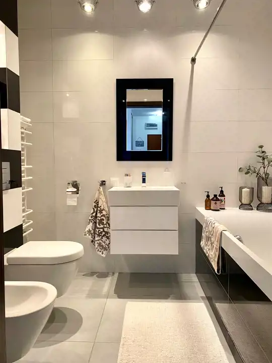 - łazienka - o pow. 7 mkw, z wanną z funkcją prysznica, wc, bidetem i umywalką, armatura firmy Villeroy & Boch.