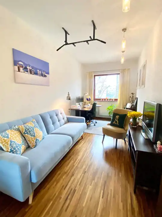 Podłogi w pokojach wyłożone parkietem egzotycznym natomiast w części holu, aneksu i łazience - kafle, ściany w gładzi. Wnętrze zmodernizowane w 2023 roku, odnowione i odmalowane, gotowe do wprowadzenia, wyposażone również w klimatyzację.