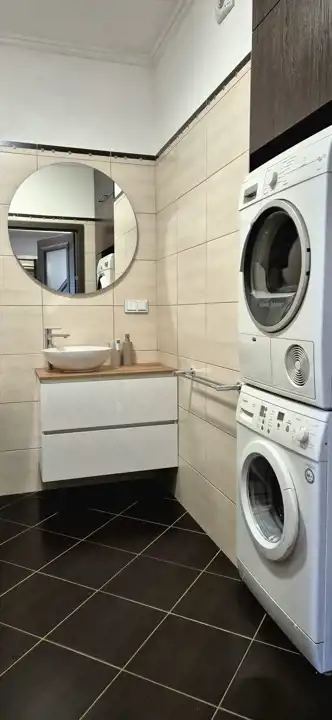 łazienka: wanna, umywalka, pralka, suszarka;