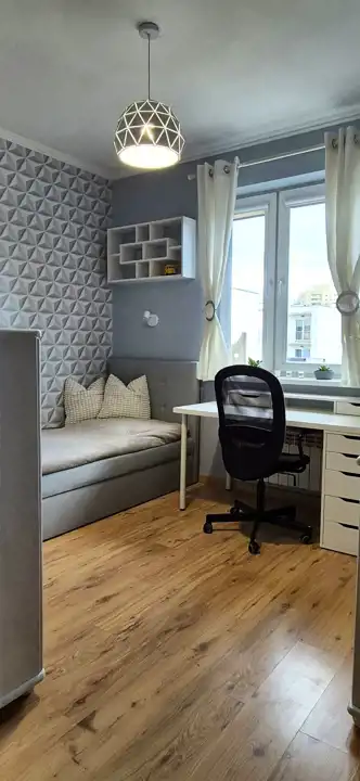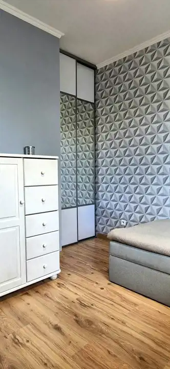 - w pokojach na ścianach gładzie gipsowe, na podłogach panele,
