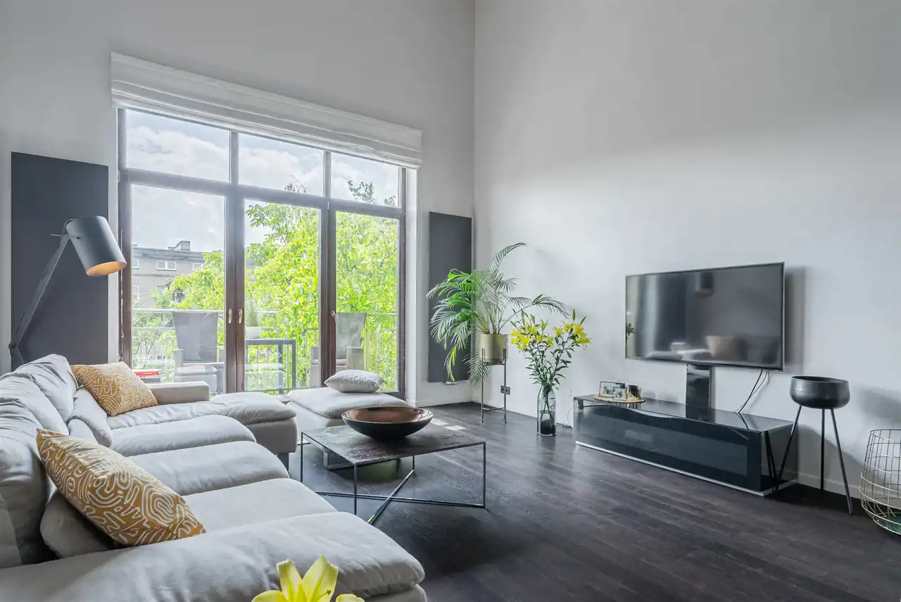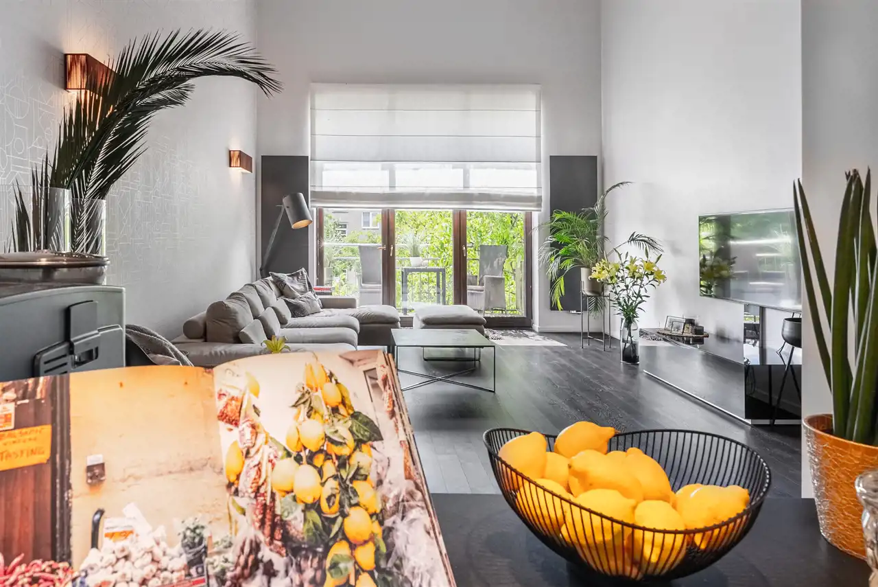 - niespotykanie przestronny salon ( wysokość 5,4m2) z dużym przeszkleniem i bezpośrednim wyjściem na balkon