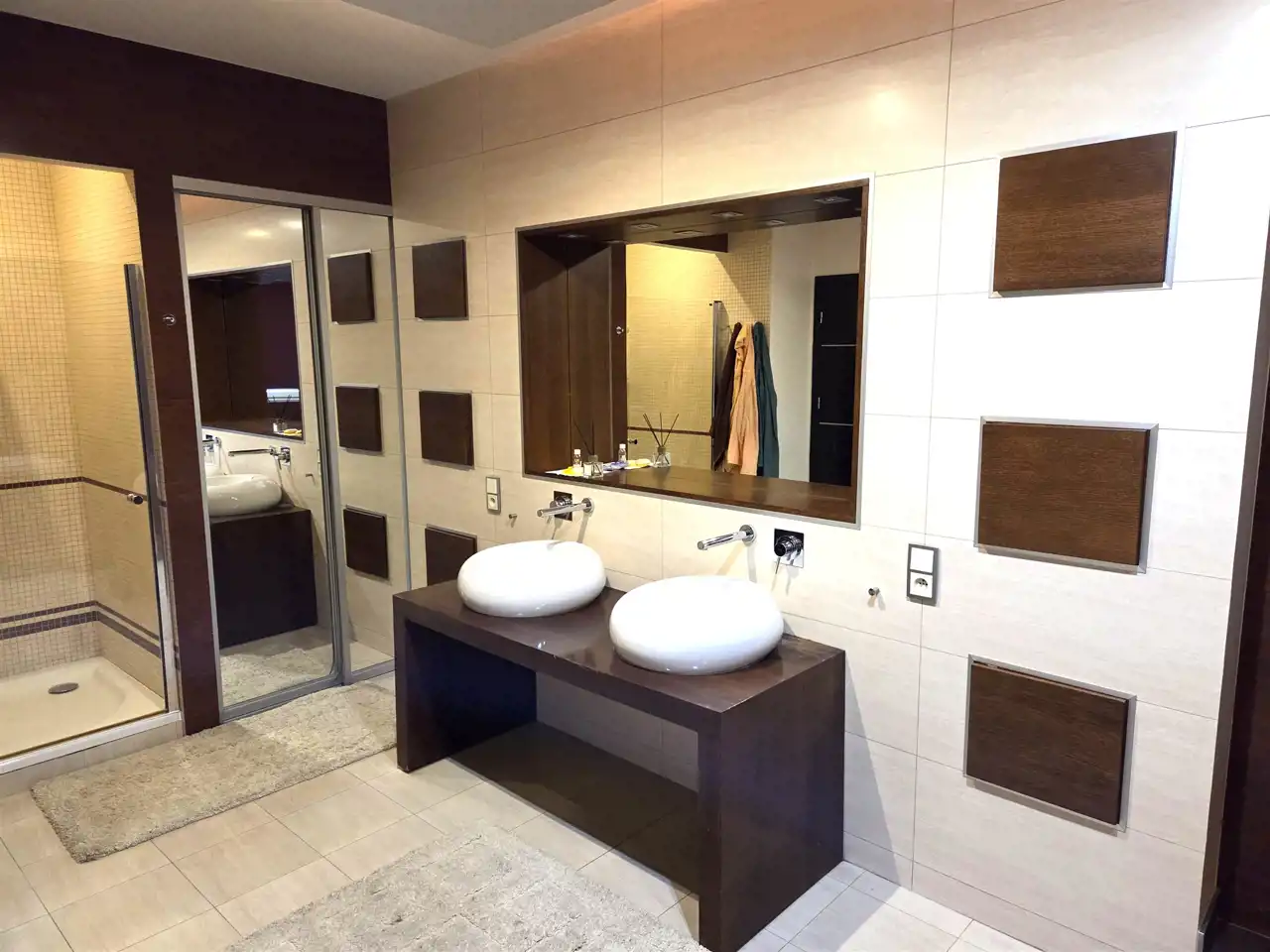 - pokój kąpielowy o powierzchni ok. 16 m2, wyposażony w wannę, prysznic, dwie umywalki oraz bidet.